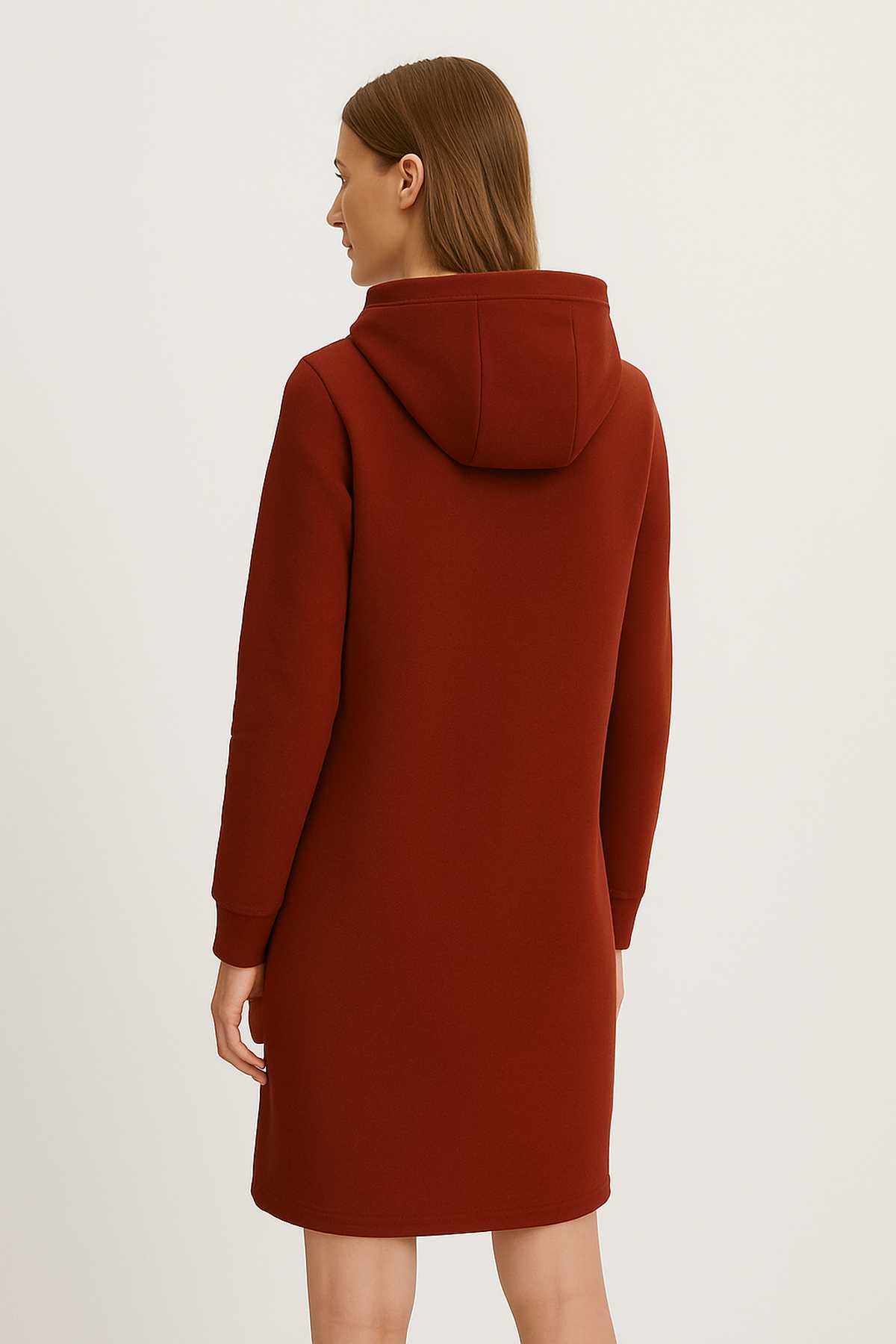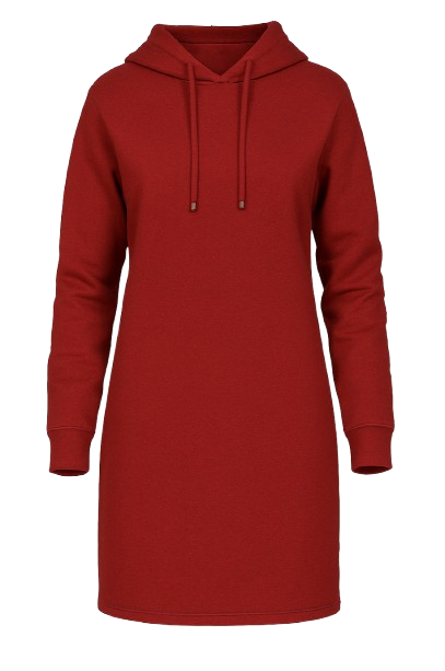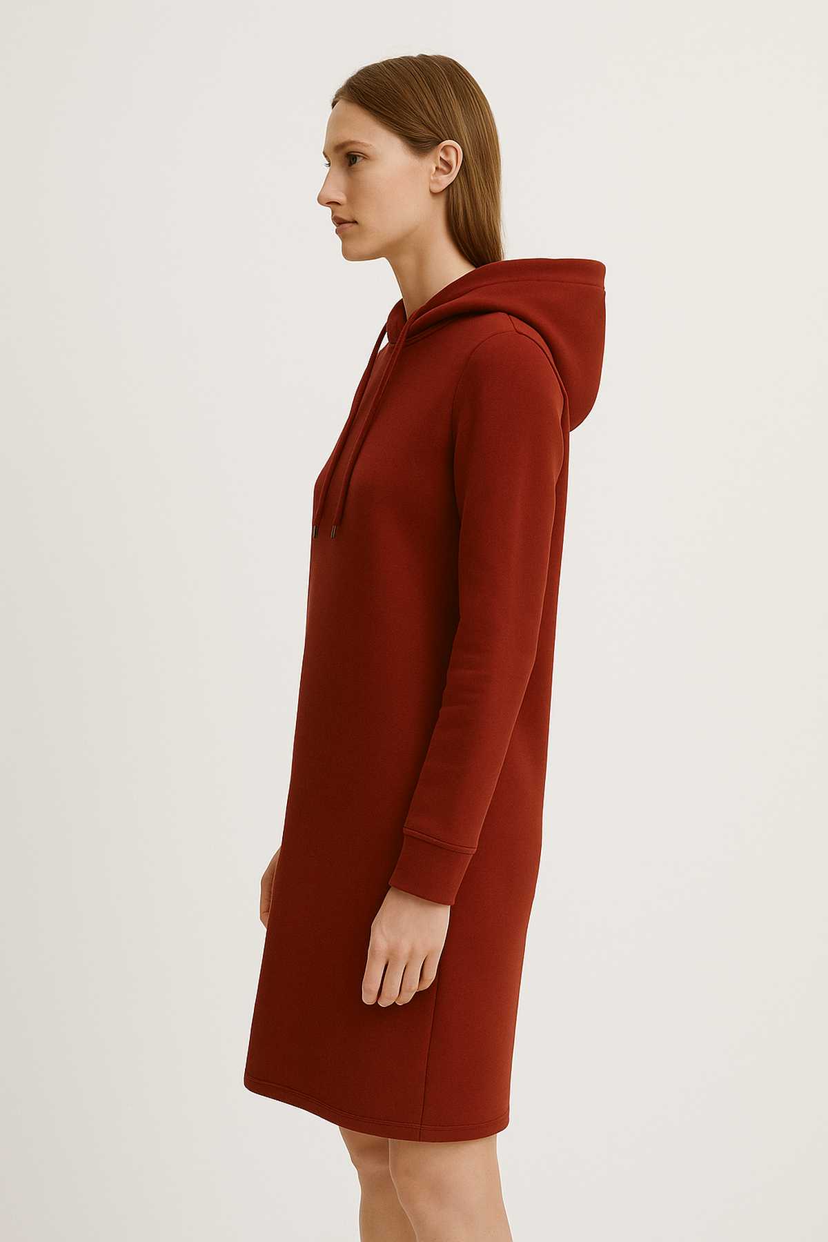 This brick red hoodie dress is made from soft heavy jersey with a touch of stretch, ensuring both comfort and durability. Featuring a straight cut, long sleeves, and a classic drawstring hood, it combines casual style with a refined silhouette. Ideal for relaxed days, it pairs effortlessly with sneakers or can be layered for a cozy yet modern look.