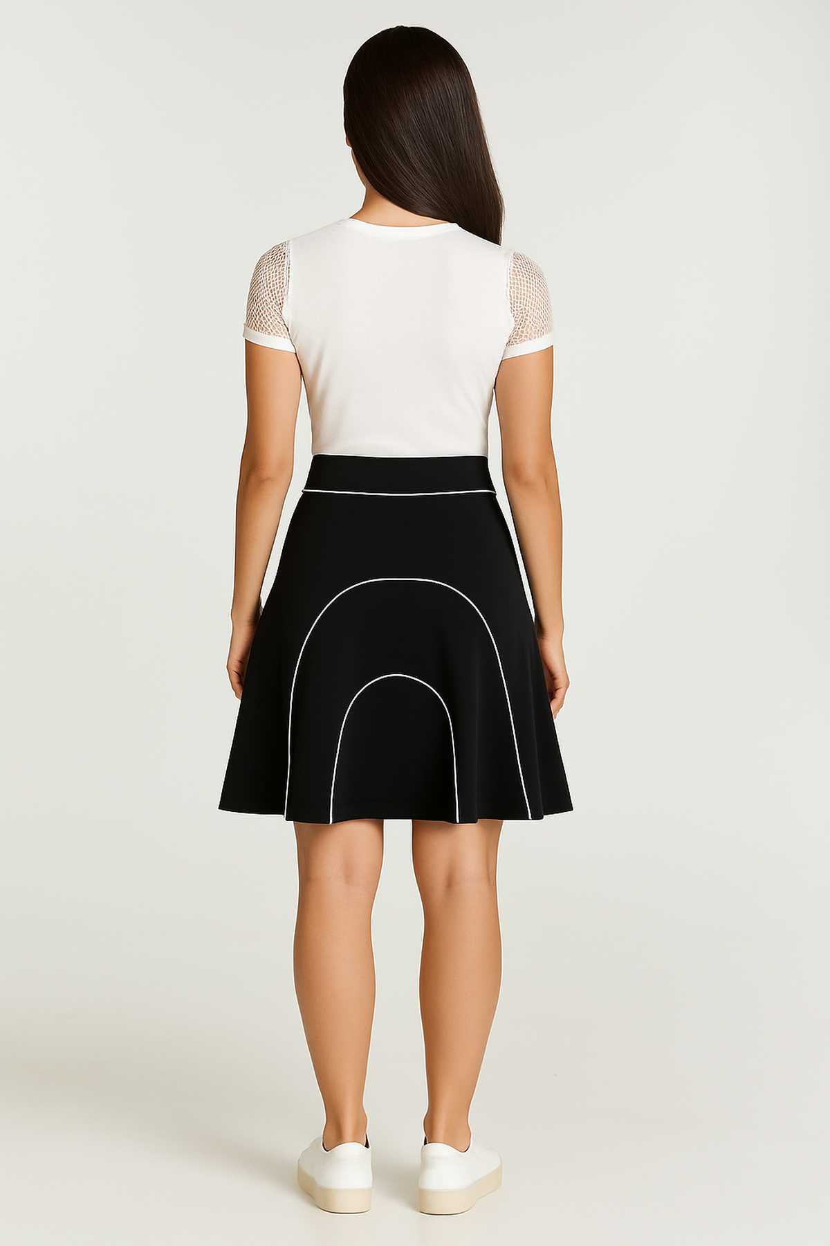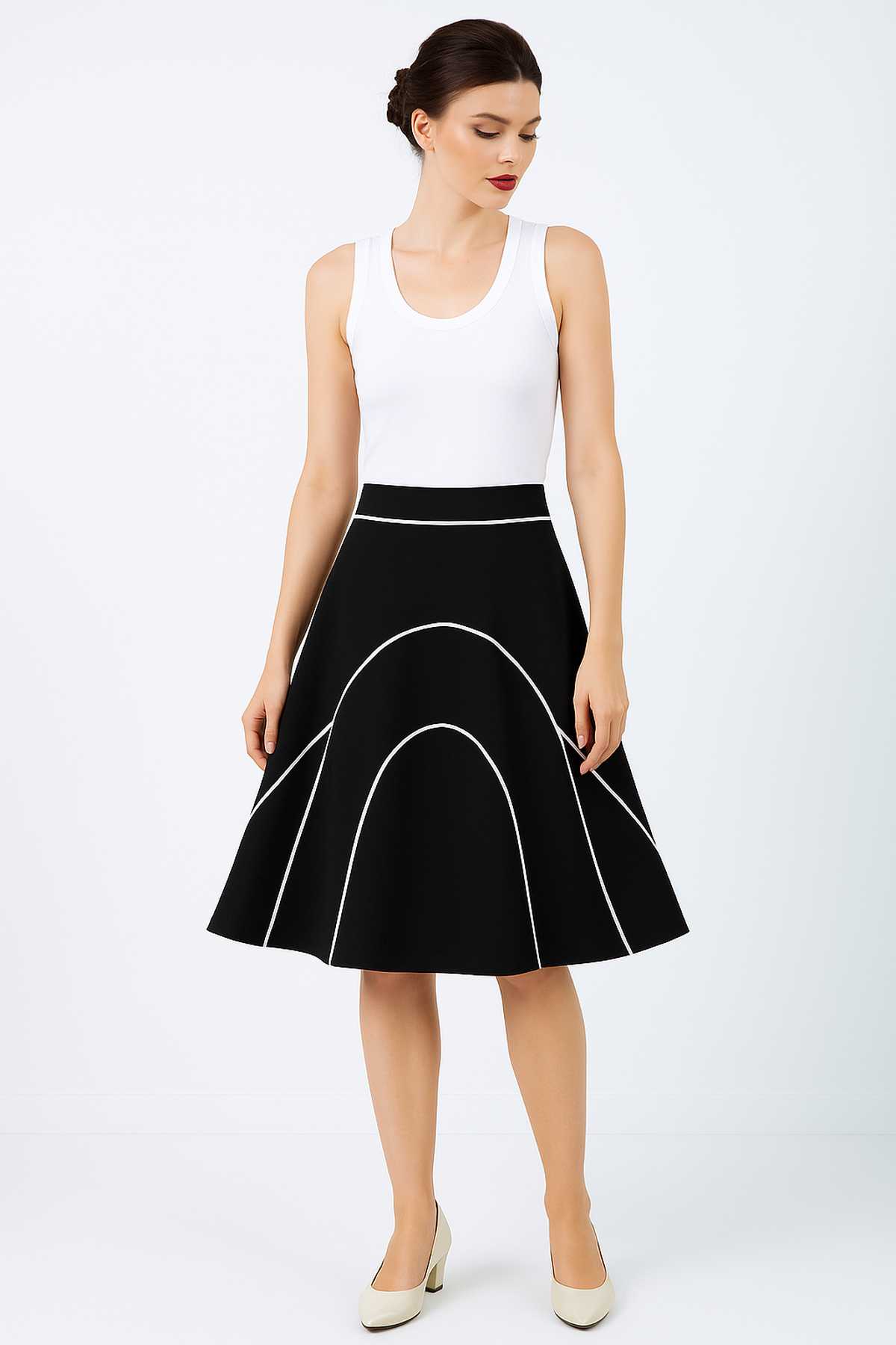 Elevate your wardrobe with this stylish black A-line skirt, crafted from a soft and stretchy jersey fabric made of viscose and elastane. Designed for both comfort and elegance, it features a flattering flared silhouette and distinctive white piping that outlines graceful arch patterns. The wide waistband ensures a smooth fit, while the knee-length cut makes it perfect for both casual and semi-formal looks. Effortlessly chic and easy to style, this skirt is a versatile staple for any season.