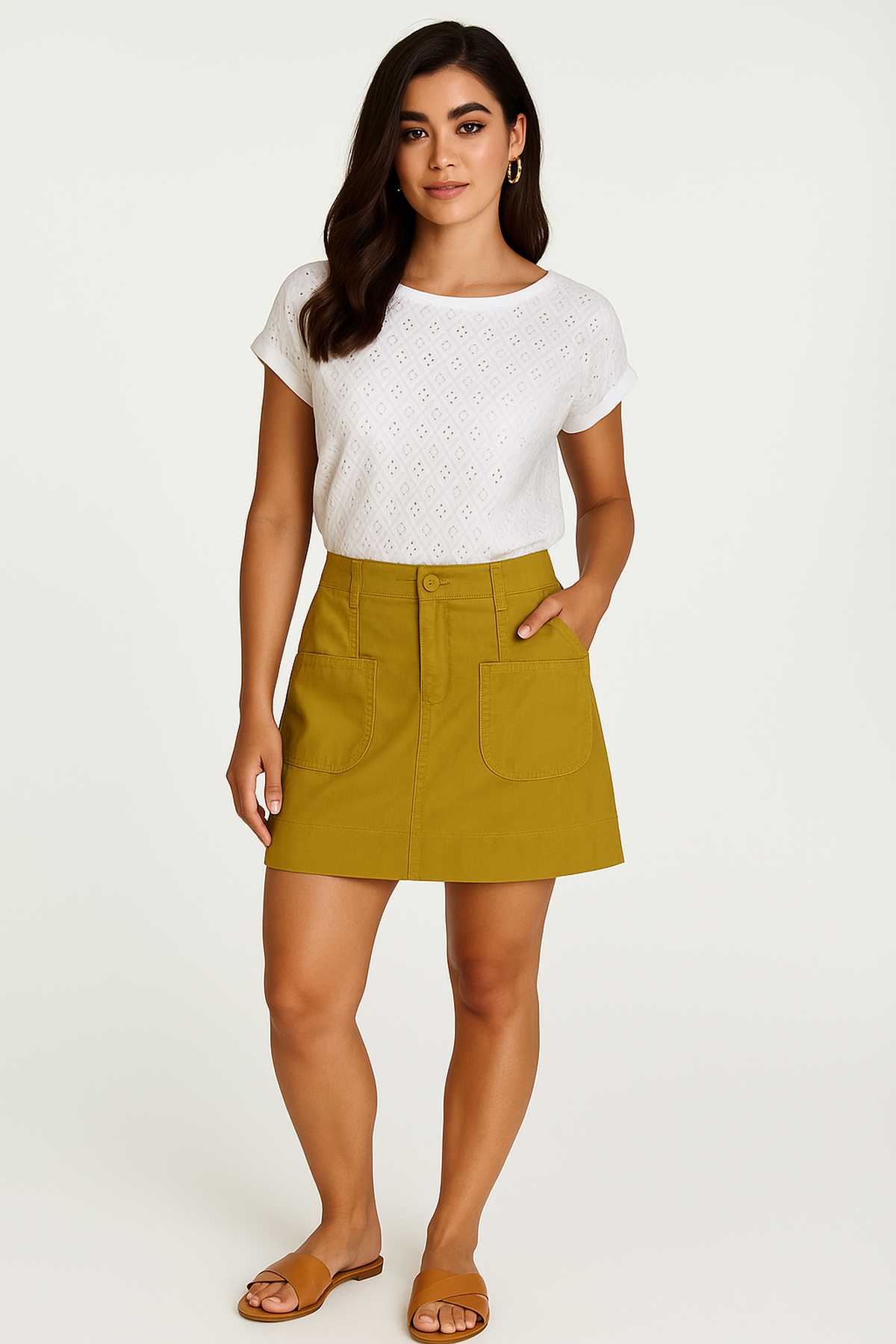 Elevate your wardrobe with this chic mustard yellow mini skirt crafted from soft, breathable Tencel woven fabric. Featuring a flattering A-line silhouette, utility-style patch pockets, and a button-zip closure, this skirt combines style and function effortlessly. The subtle tie-dye effect adds a unique, handcrafted touch, while the belt loops and structured stitching enhance its modern edge. Perfect for warm-weather days or layering in cooler months.