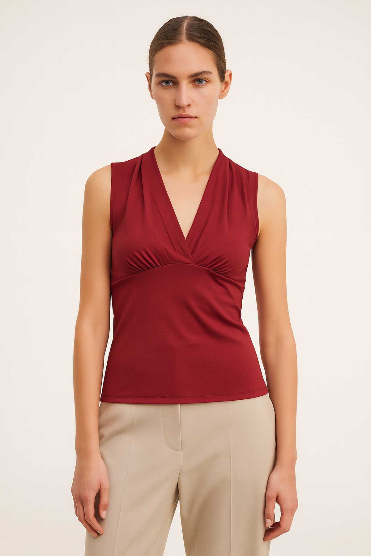 This sleeveless top in deep burgundy is crafted from a soft cotton-elastane jersey, offering both comfort and a flattering fit. Designed with a feminine V-neckline and subtle pleats under the bust, it creates an elegant silhouette while maintaining everyday wearability. Perfect for pairing with tailored trousers or skirts, this versatile piece transitions seamlessly from office to evening.