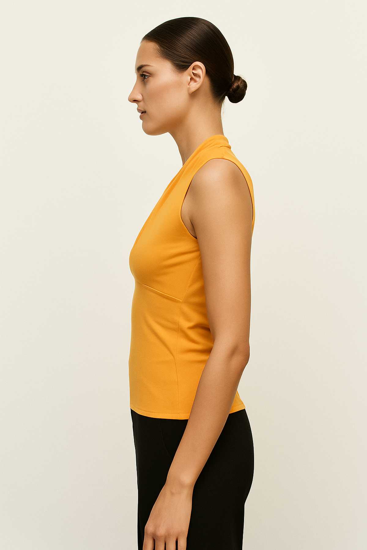 A sleek sleeveless top crafted from soft stretch jersey in a warm amber hue. Designed with a draped V-neckline and subtle under-bust seam for a flattering silhouette. Minimalist and versatile, it pairs effortlessly with tailored trousers or relaxed denim for modern everyday dressing.