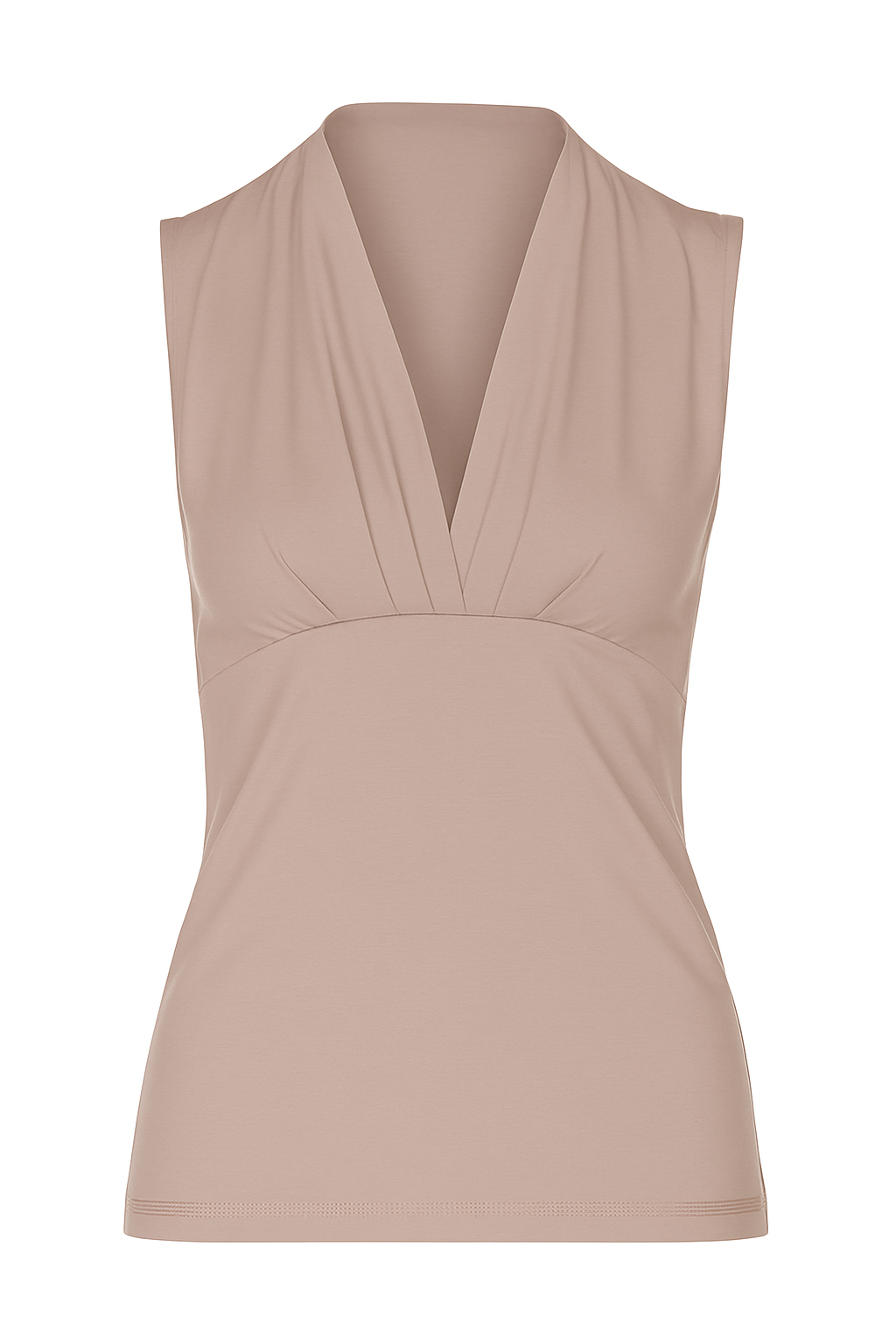 Sleeveless jersey top crafted from a soft viscose and elastane blend. Features a deep V-neckline with subtle front pleats and a fitted silhouette. Designed for comfort with a smooth finish and slight stretch for ease of movement. Perfect for layering or wearing on its own.