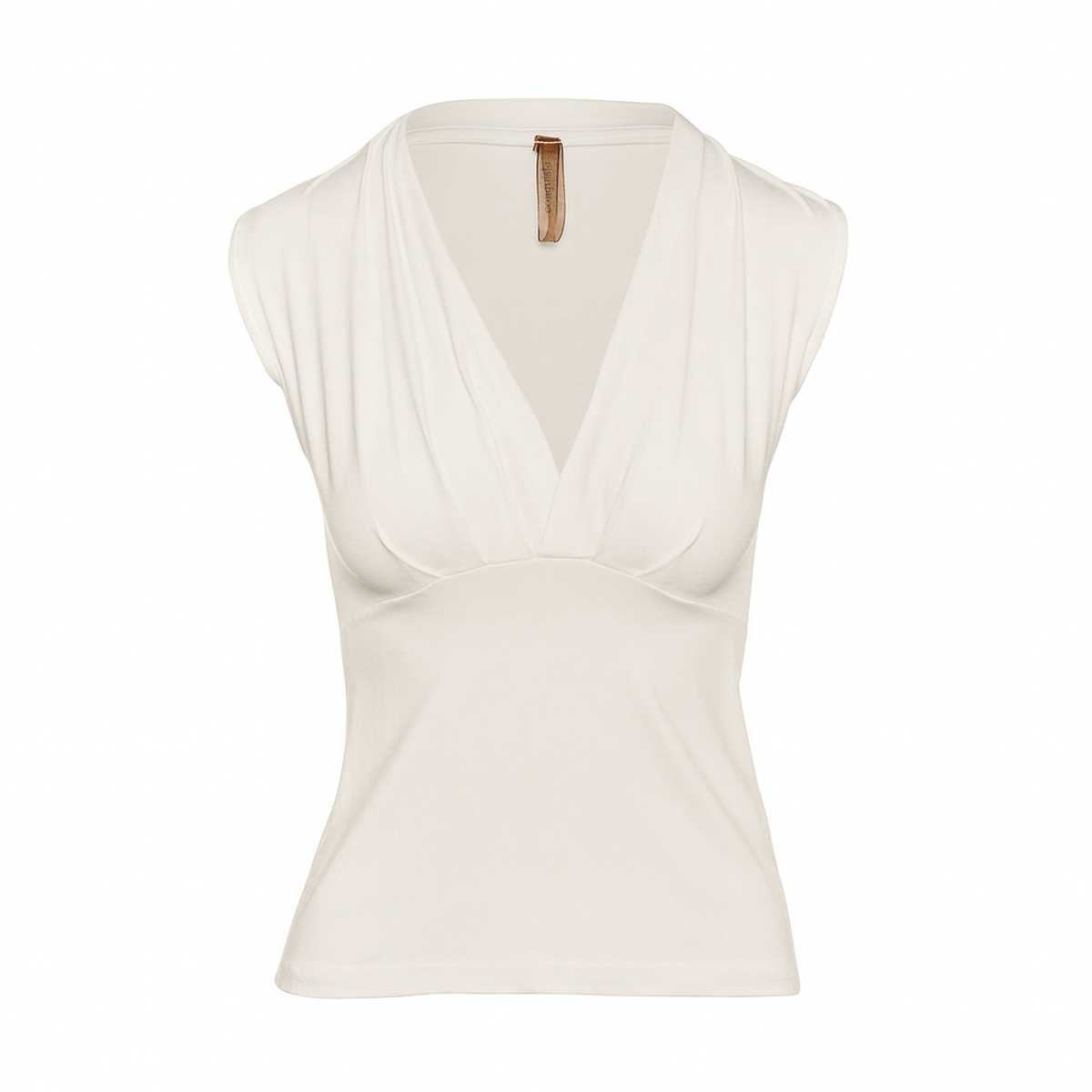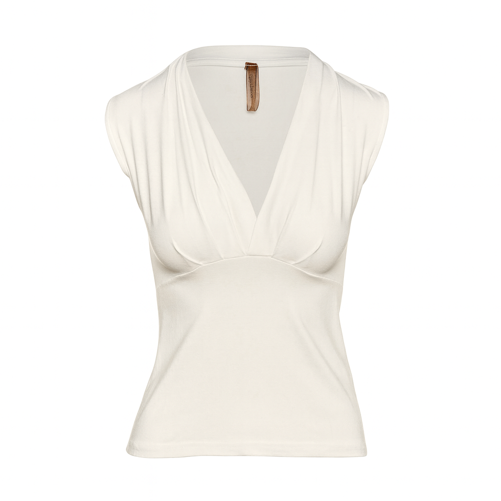 Crafted from a soft jersey cotton with a touch of elastane, this sleeveless top combines comfort with a fluid, elegant silhouette. The draped V-neckline and lightly gathered detailing at the bust create a refined look, while the close fit at the waist ensures a flattering shape. A versatile piece that transitions effortlessly from day to evening, designed for layering or wearing on its own.