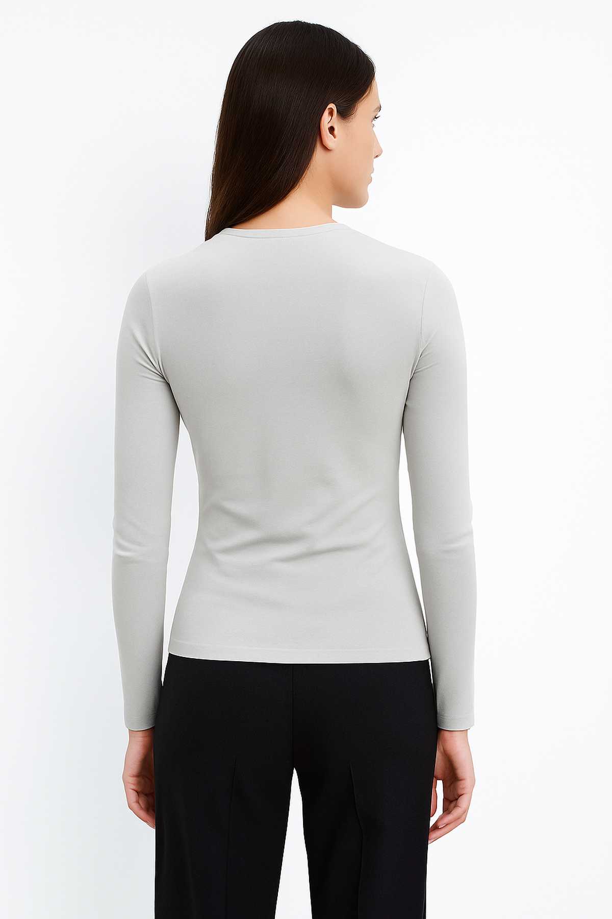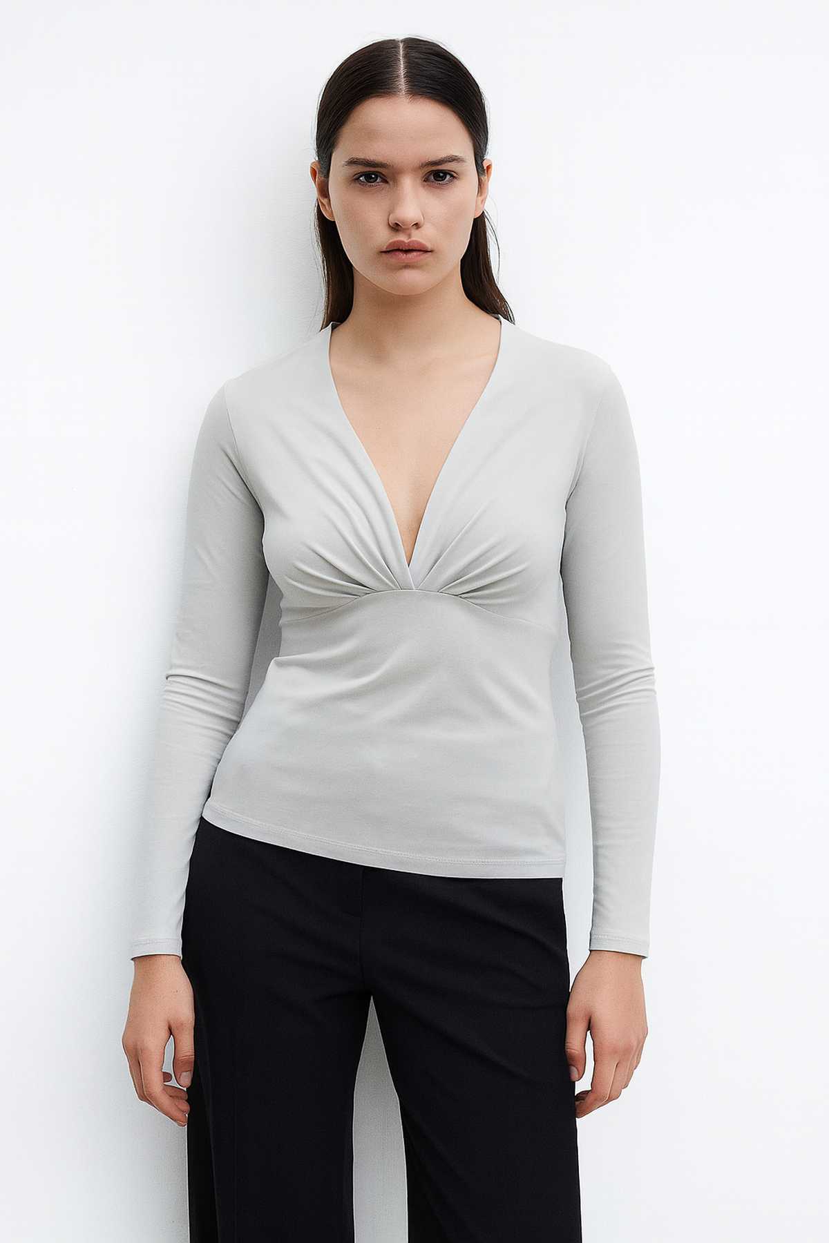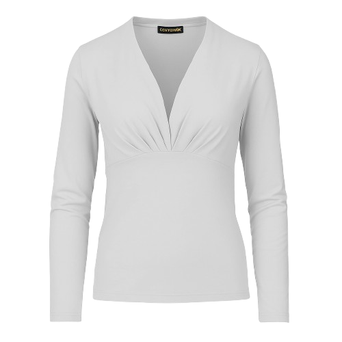 Crafted from a soft jersey blend of cotton and elastane, this long sleeve top combines everyday comfort with a touch of sophistication. Featuring a flattering deep V-neckline with subtle front pleating under the bust, it offers a gently tailored silhouette that enhances the natural shape while maintaining ease of movement. Perfect for both casual wear and office-ready outfits, this versatile piece pairs effortlessly with jeans, skirts, or tailored trousers, making it a timeless addition to any wardrobe.