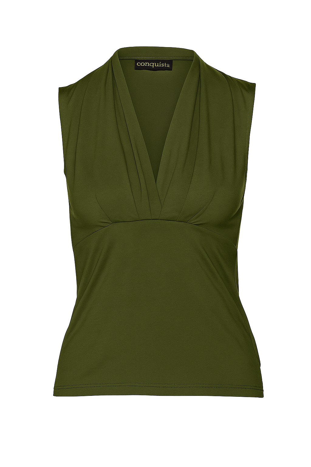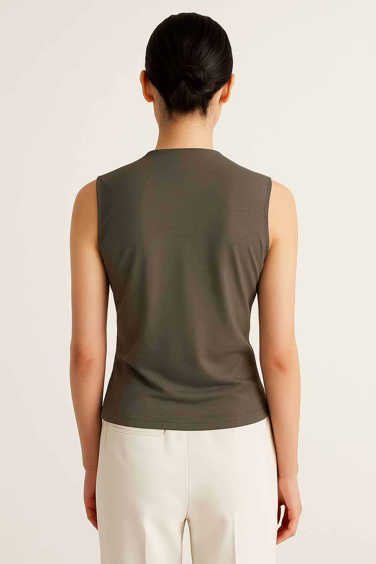 A modern sleeveless top in a refined khaki shade, made from soft and stretchy viscose-elastane jersey. The draped V-neckline and gently gathered waistline create a flattering fit that highlights the figure while ensuring all-day comfort. Versatile and elegant, this top pairs effortlessly with tailored trousers, skirts, or casual denim, making it a chic choice for both workwear and relaxed styling.
