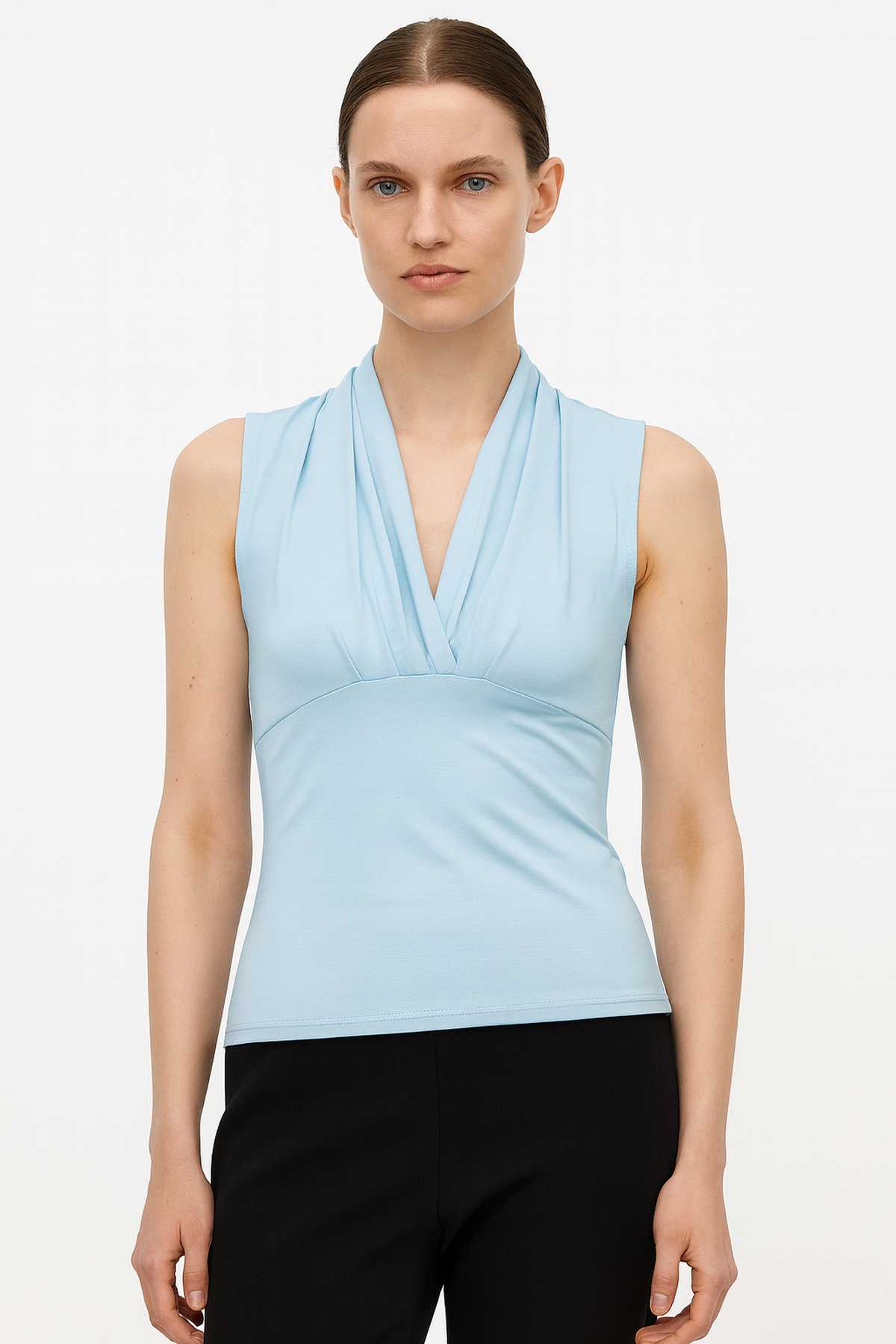 Crafted from a soft jersey fabric, this sleeveless top combines viscose with a touch of elastane for comfort and stretch. Designed with a flattering V-neckline and gentle draping, it offers a sleek silhouette that transitions effortlessly from day to evening. The lightweight material ensures breathability, while the elastane provides ease of movement. A versatile piece that pairs seamlessly with both tailored trousers and casual denim.