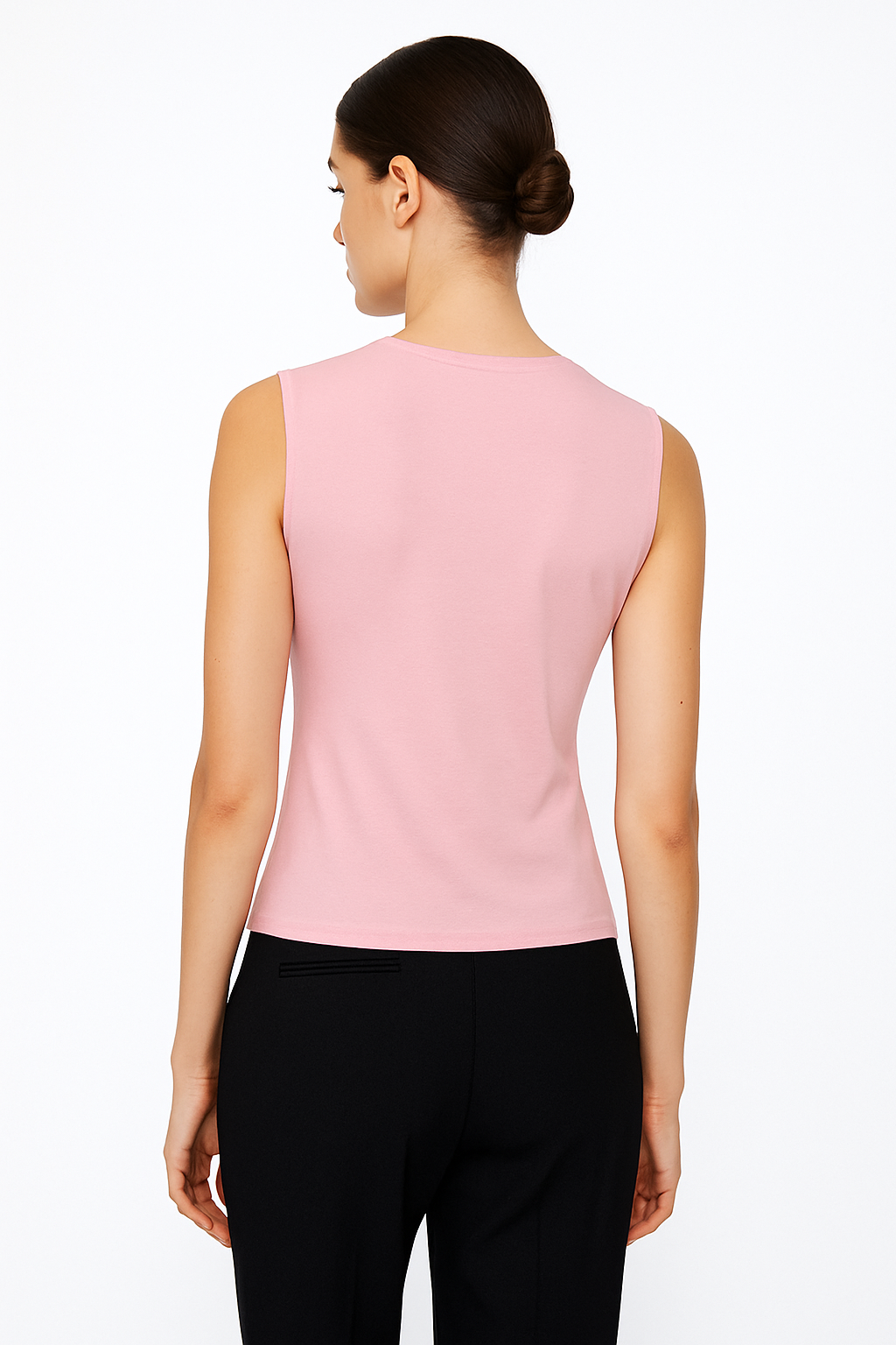 A soft and elegant sleeveless jersey top crafted from premium micromodal with a touch of elastane for perfect stretch and comfort. Designed with a flattering V-neckline and subtle pleating under the bust, this top offers a refined yet versatile look. The lightweight fabric drapes beautifully, making it ideal for both casual styling and layering under blazers or cardigans.