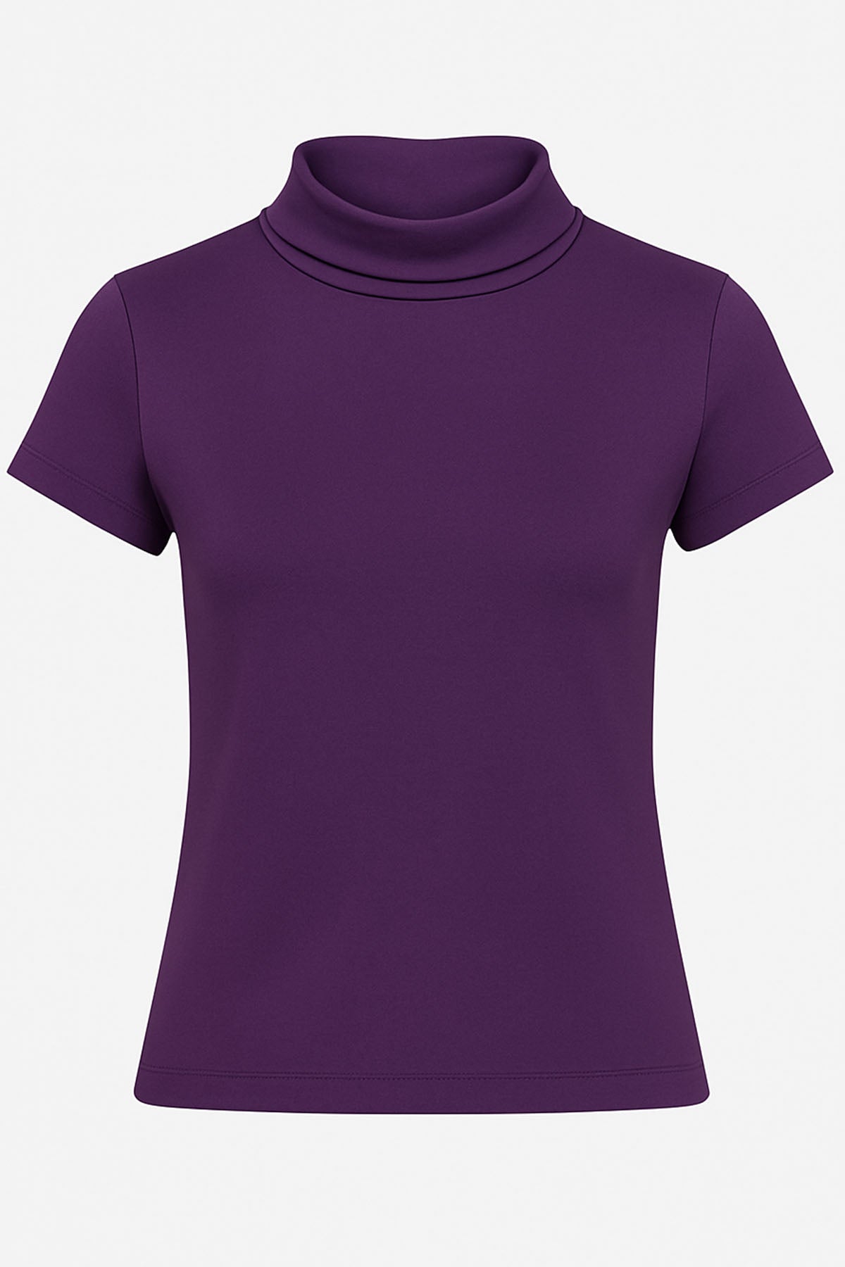 Mauve top in stretch fabric. Low folded turtleneck and short sleeves. Darts at the bust. Fastens in the back with a thick plastic zip, tone on tone. Straight silhouette. Our model is 176cm and is wearing size 36/S. Measurements for size 36/M (in cm): Shoulder -36, Chest-43, Waist-45, Bottom-48, Sleeve length -16, Body length-57. Accessories are not included. 70%viscose-25%polyamid-5%elastane. Gentle machine wash. Turn garment inside out. Cold water. Mild detergent. Iron on reverse side. Do not tumble dry. Do not bleach.
