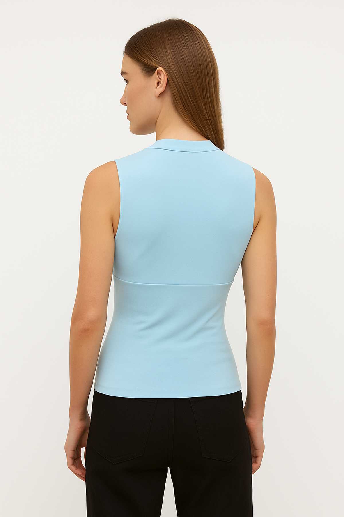 A sleeveless top crafted from soft viscose-elastane jersey in a fresh sky blue shade. Designed with a flattering V-neckline and gentle pleats at the bust, it offers both comfort and elegance. The stretch fabric ensures a perfect fit, making it easy to style for both casual and refined looks.