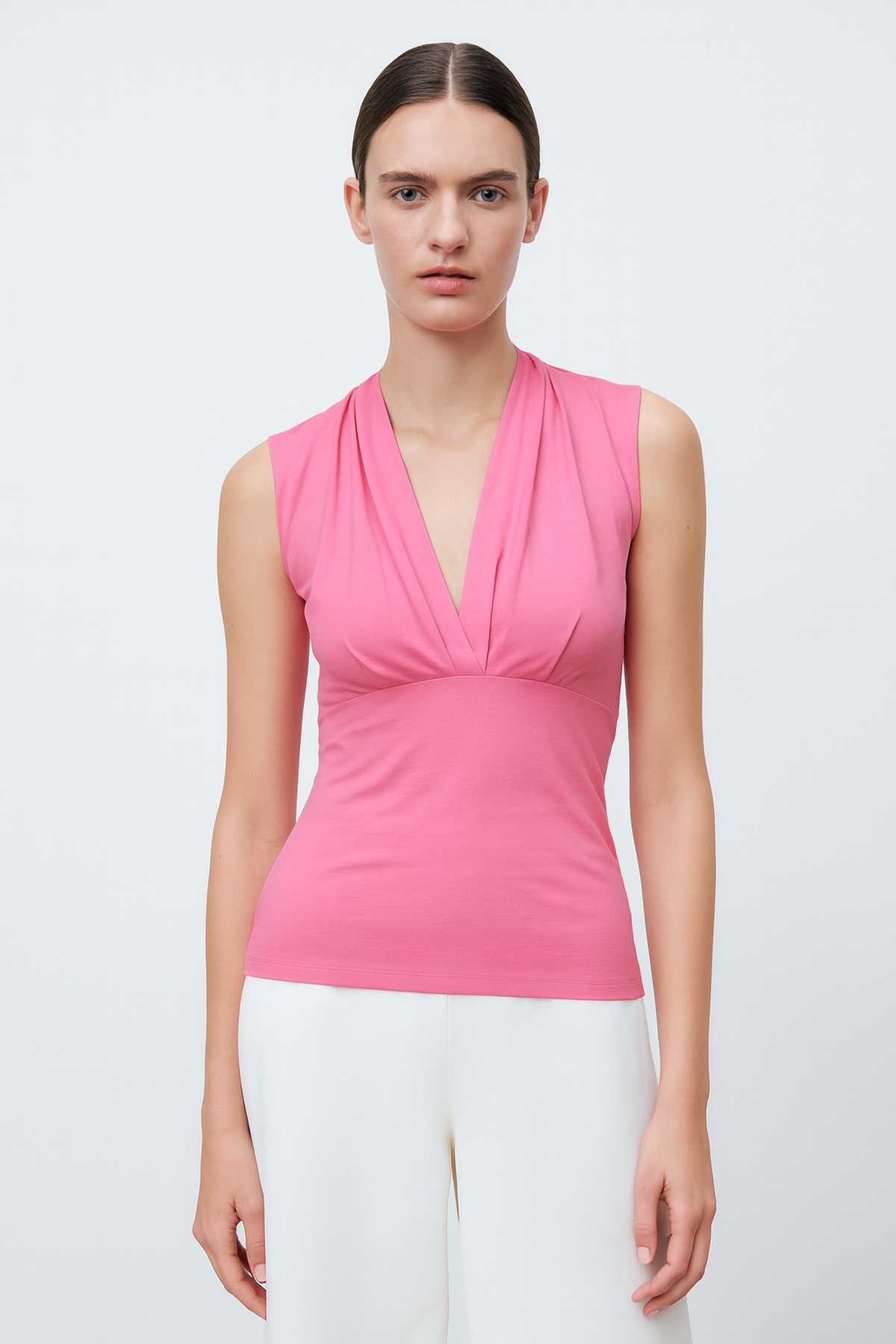 A sleek and feminine sleeveless top designed with a softly draped V-neckline and subtle gathering under the bust for a flattering fit. Crafted from lightweight stretch fabric, it offers both comfort and elegance. Perfect for pairing with tailored trousers or casual denim, this versatile piece transitions effortlessly from day to evening.