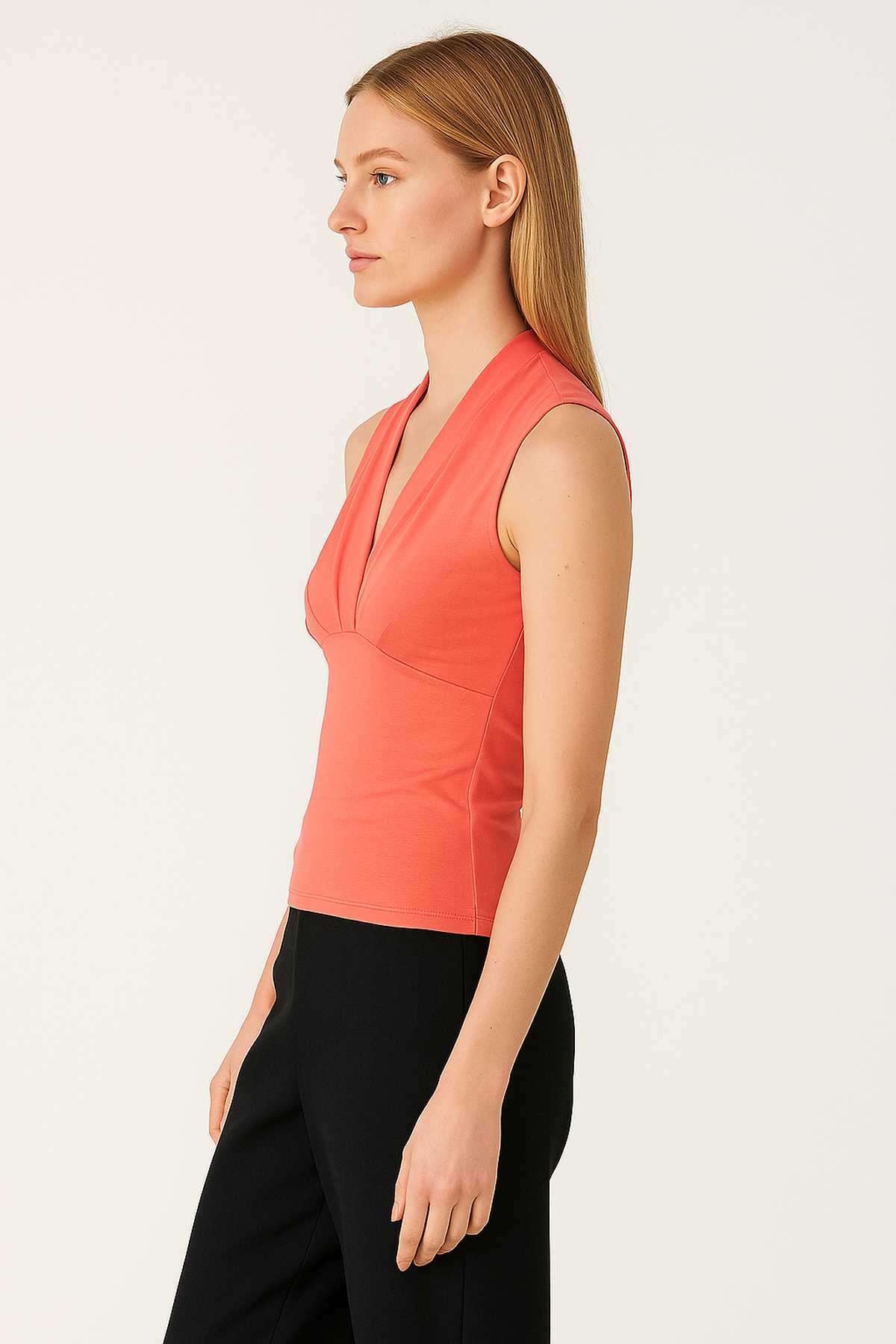 Minimalist sleeveless jersey top crafted from a soft blend of viscose and elastane. Designed with a flattering V-neckline and subtle pleat details at the bust, this fitted piece offers both comfort and elegance. The breathable fabric ensures a smooth silhouette, making it versatile for pairing with tailored trousers or casual separates.