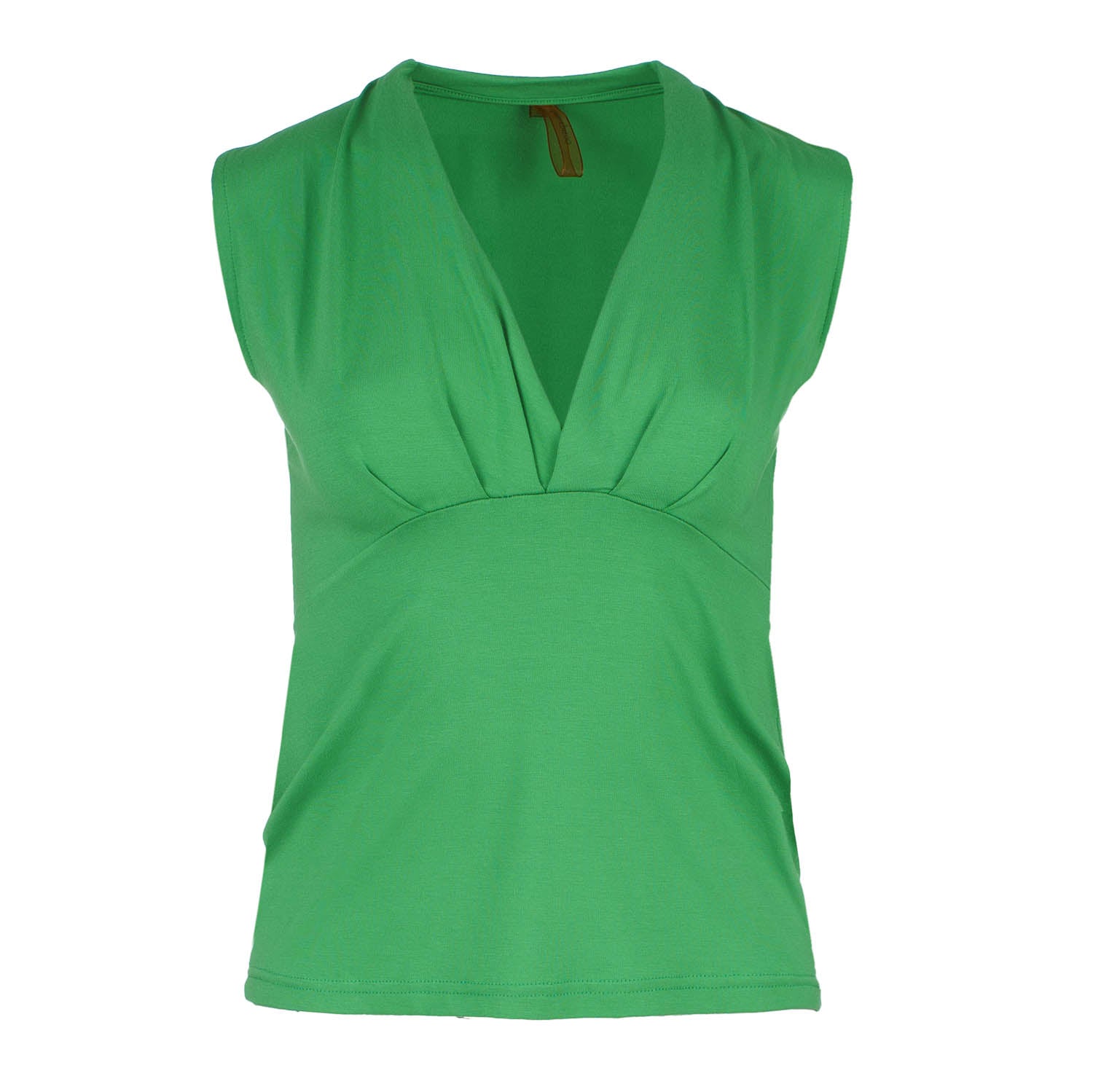 Πράσινο τοπ CONQUISTA από ελαστικό ύφασμα: βισκόζη-ελαστάνη. Αμάνικο με ψεύτικο τελείωμα μπροστά που δημιουργεί βαθύ V ντεκολτέ. Ραφή κάτω από το στήθος. 92% βισκόζη-8% ελαστάνη. Μετρήσεις για μέγεθος 36/S (σε cm): Πλάτος ώμων-31, Στήθος-38, Μέση-35, Στριφάρι-40, Μήκος σώματος-50.