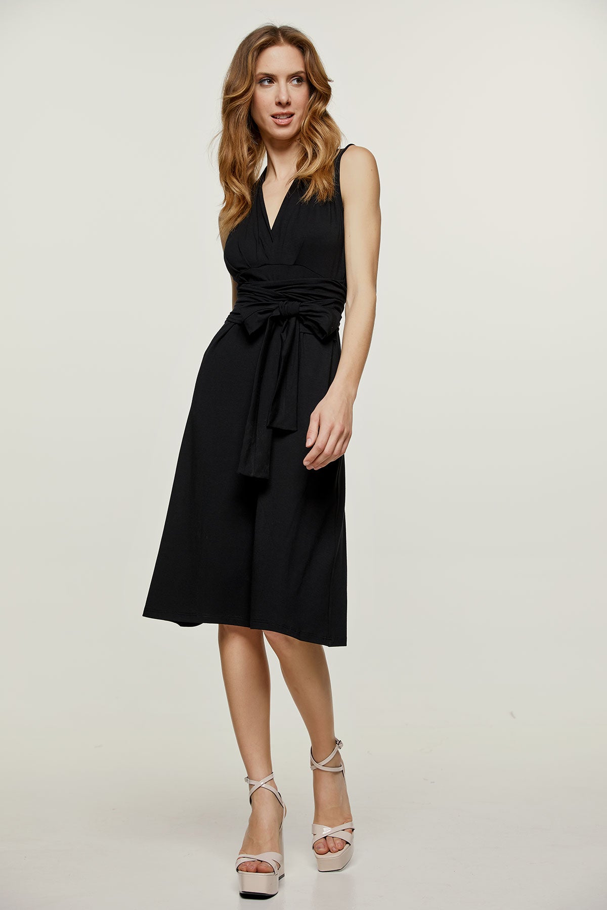 Καλοκαιρινό φόρεμα από μονόχρωμο ελαστικό ύφασμα ζέρσεϊ. Αμάνικο με βαθύ ντεκολτέ V με πιέτες αριστερά και δεξιά. Λεπτομέρεια ραφής κάτω από το στήθος με πιέτες από κάτω. Ζώνη από το ίδιο ύφασμα που κουμπώνει στα πλάγια. Γραμμή Empire με γραμμή Α. Μήκος μέχρι το γόνατο. Το μοντέλο μας έχει ύψος 172 εκ. και φοράει μέγεθος 36/S. Μετρήσεις για το μέγεθος 36 (σε cm): Ώμοι -35, Στήθος-38, Μέση-38, Κάτω μέρος-47, Μήκος σώματος-101. 92% βισκόζη-8% ελαστάνη. Απαλό πλύσιμο στο πλυντήριο. Γυρίστε το ρούχο από την ανάποδη. Κρύο νερό. Ήπιο απορρυπαντικό. Σιδερώστε από την ανάποδη πλευρά. Μην το στεγνώνετε στο στεγνωτήριο. Μην χρησιμοποιείτε χλωρίνη.
