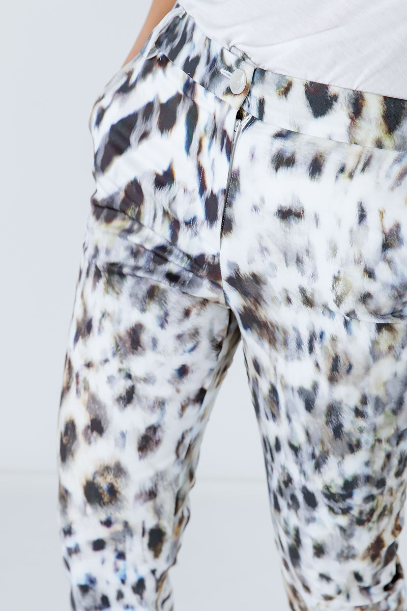 Fitted ankle length pants in animal print stretch woven gabardine. 2 interior pockets in the front and 2 faux pocket in the back. Waistband with belt loops. Concealed zip fastening with ecru plastic button in the front. Our model is 172cm and is wearing size 36/S. Measurements for size 36 (in cm): Waist-36, Bottom-45, Body length-92/66. 97%cotton-3%elastan