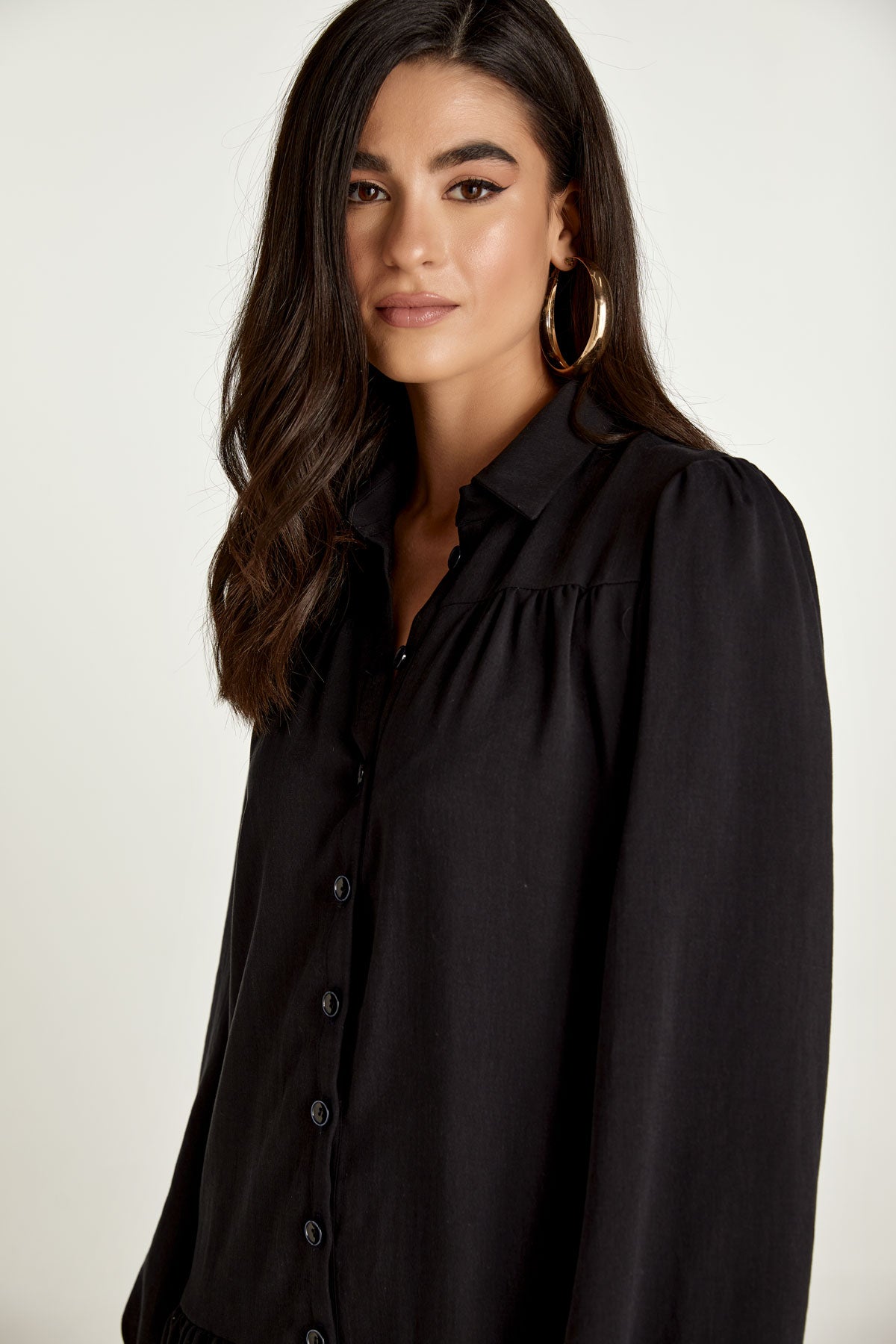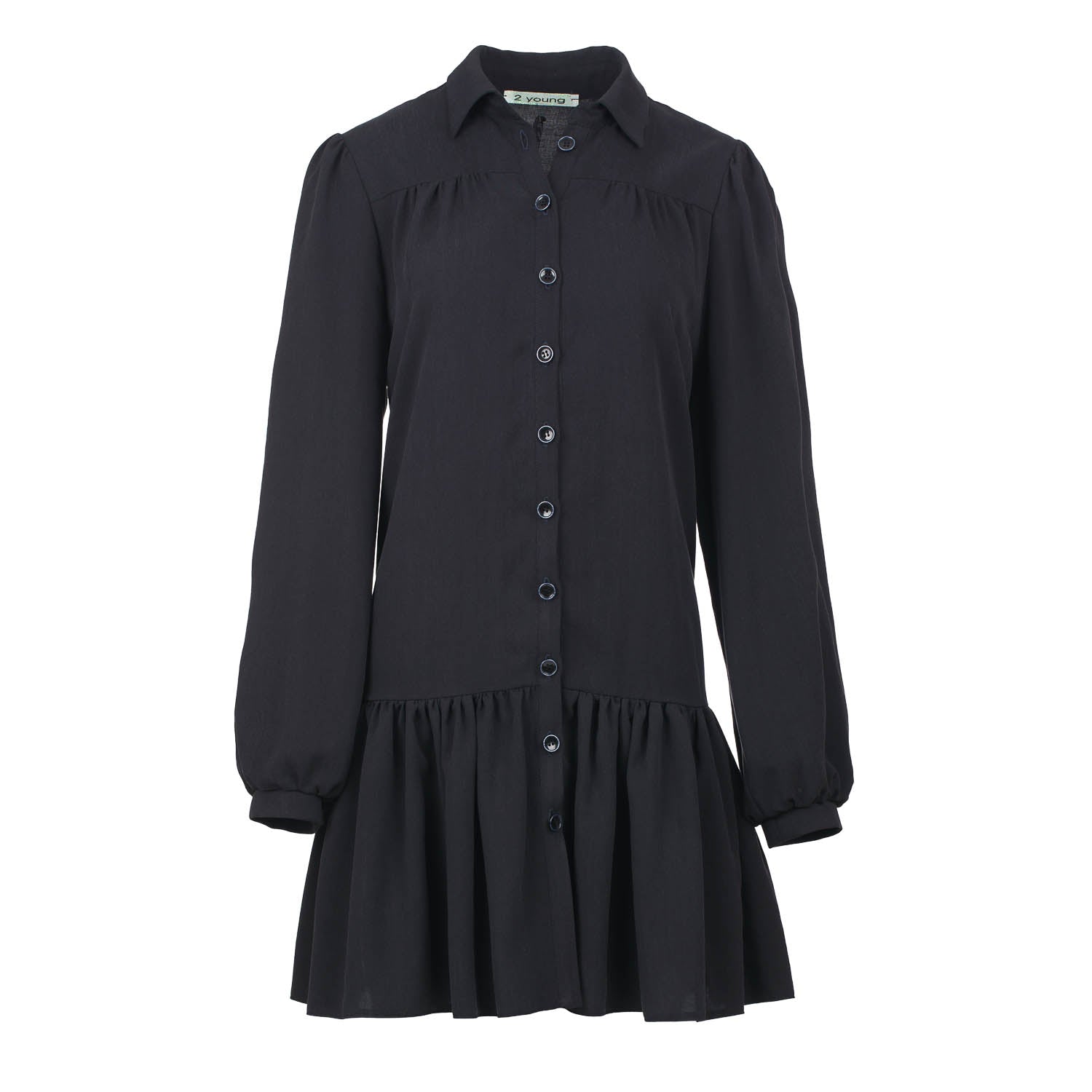 This long sleeve black dress is crafted in woven tencel. It has a collar and a placket in the front which fastens with decorative black plastic buttons. The sleeves have 3cm cuffs which fasten with a button. There are gathers on the shoulders and 12cm below is a seam with gathers underneath. 30cm from the hem there is a seam with gathers.