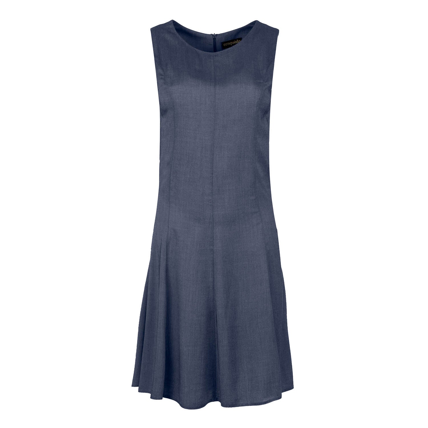 This dress is crafted in blue denim style woven viscose. It is sleeveless and has a round neckline. There is concealed zip fastening in the back. Vertical seams on the body create the perfect fit. The dress is fitted on the body opening up into a cloche style skirt from the waist.