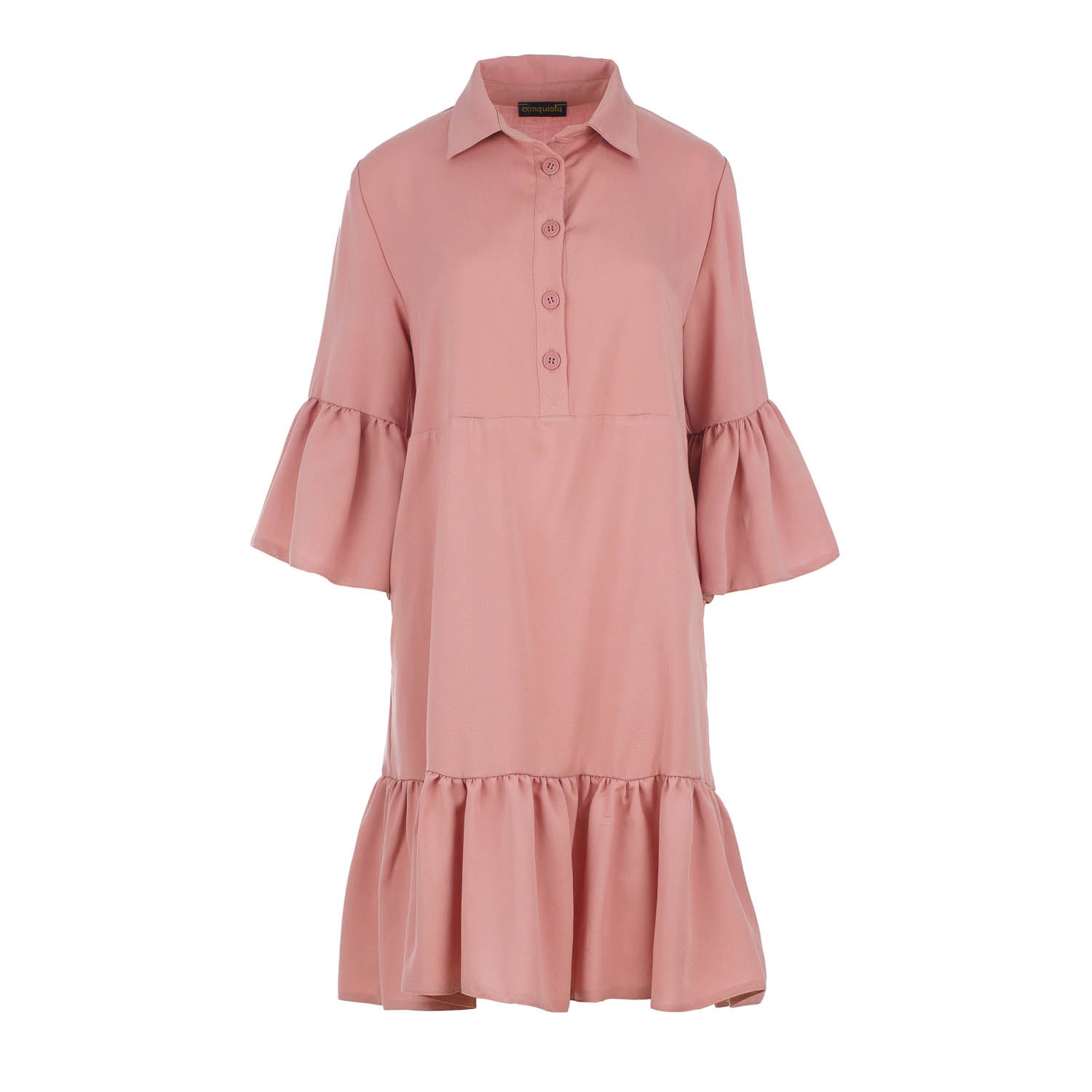 This Blush Pink Tencel Shirt Dress is crafted in woven stretch poplin style fabric. It has ¾ length bell sleeves. There is a collar and a placket to the waist which fastens with plastic buttons. A seam under the bust ensures the perfect fit. It has a wide ruffle hem. The dress is styled in a loose fit and hits above the knee.