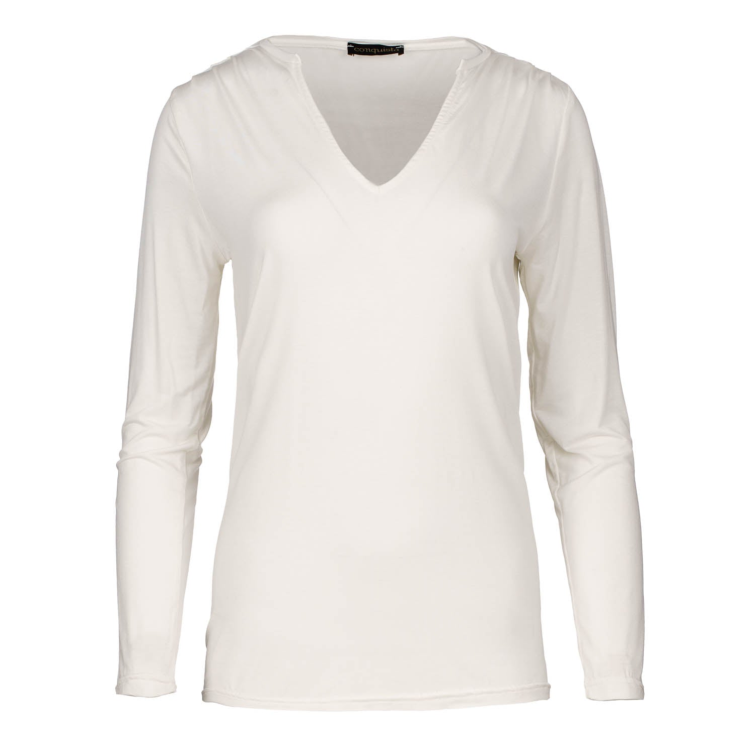 This long sleeve cream top is crafted in stretch jersey fabric: micromodal-elastane. It has a deep V neckline, interior trim at the neck and pleats on the front and back of the shoulder. This garment is styled in a relaxed straight silhouette.