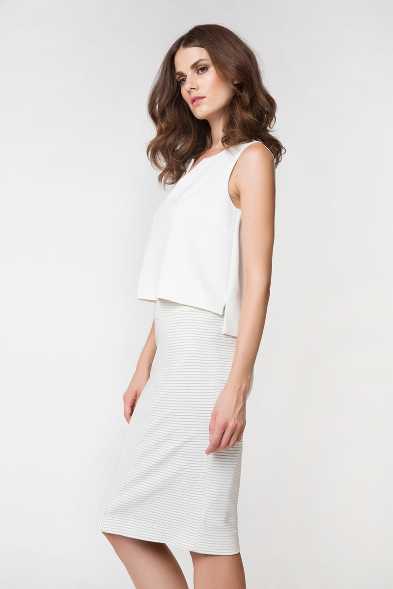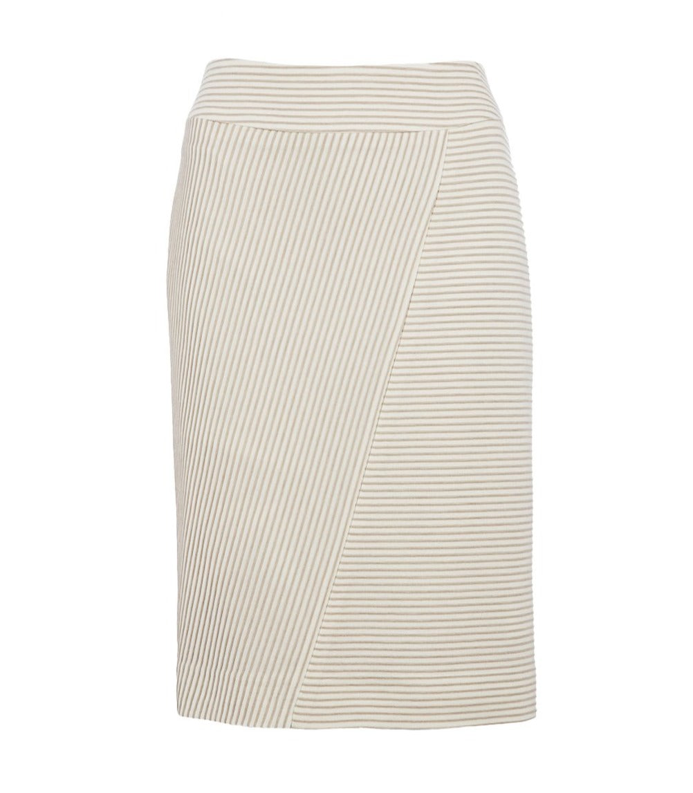 Pencil skirt in a stretch lined knit fabric in a cream-iron colour. A diagonal seam in the front and a vertical seam in the back. Cream lining. Wide waistband: 6cm. Small slit at the back: 9cm. Length for size 38: 61cm.