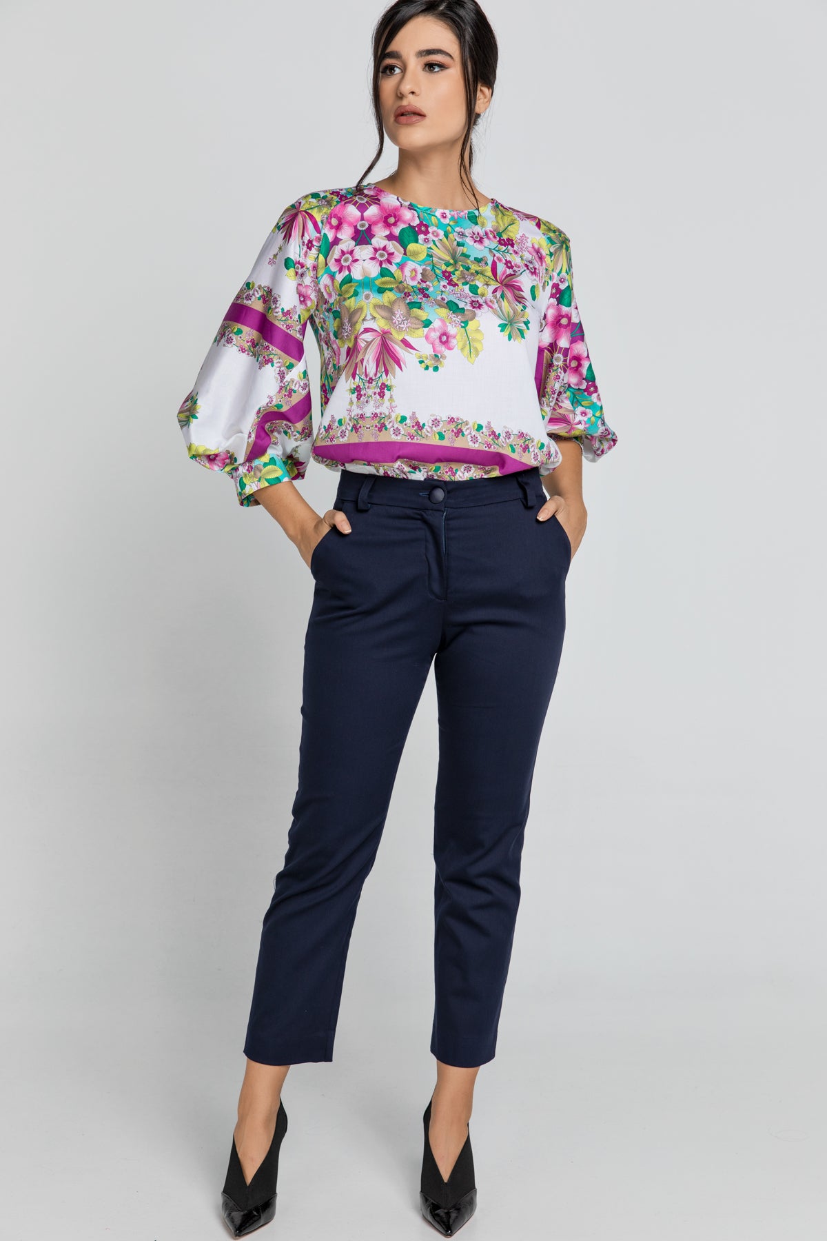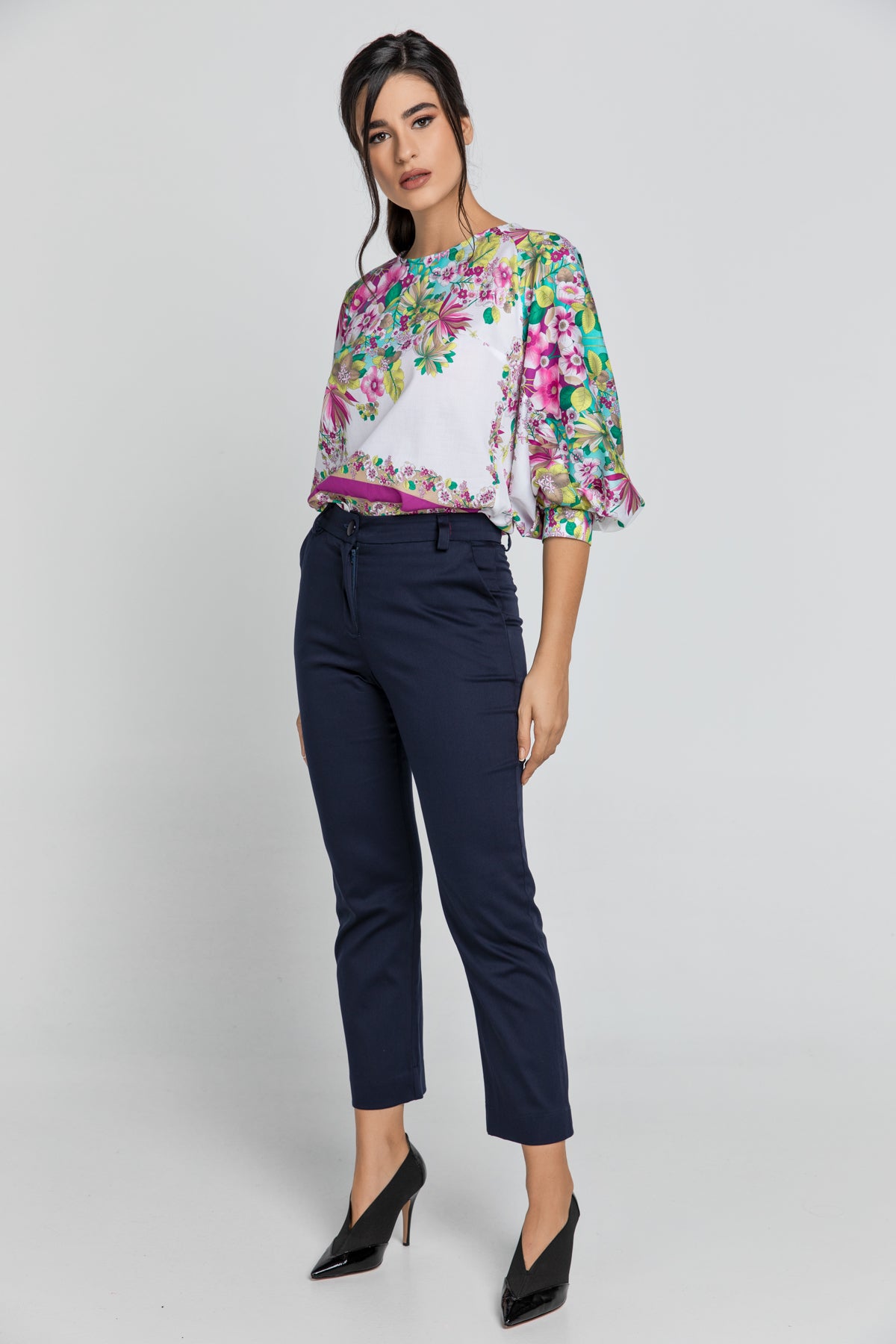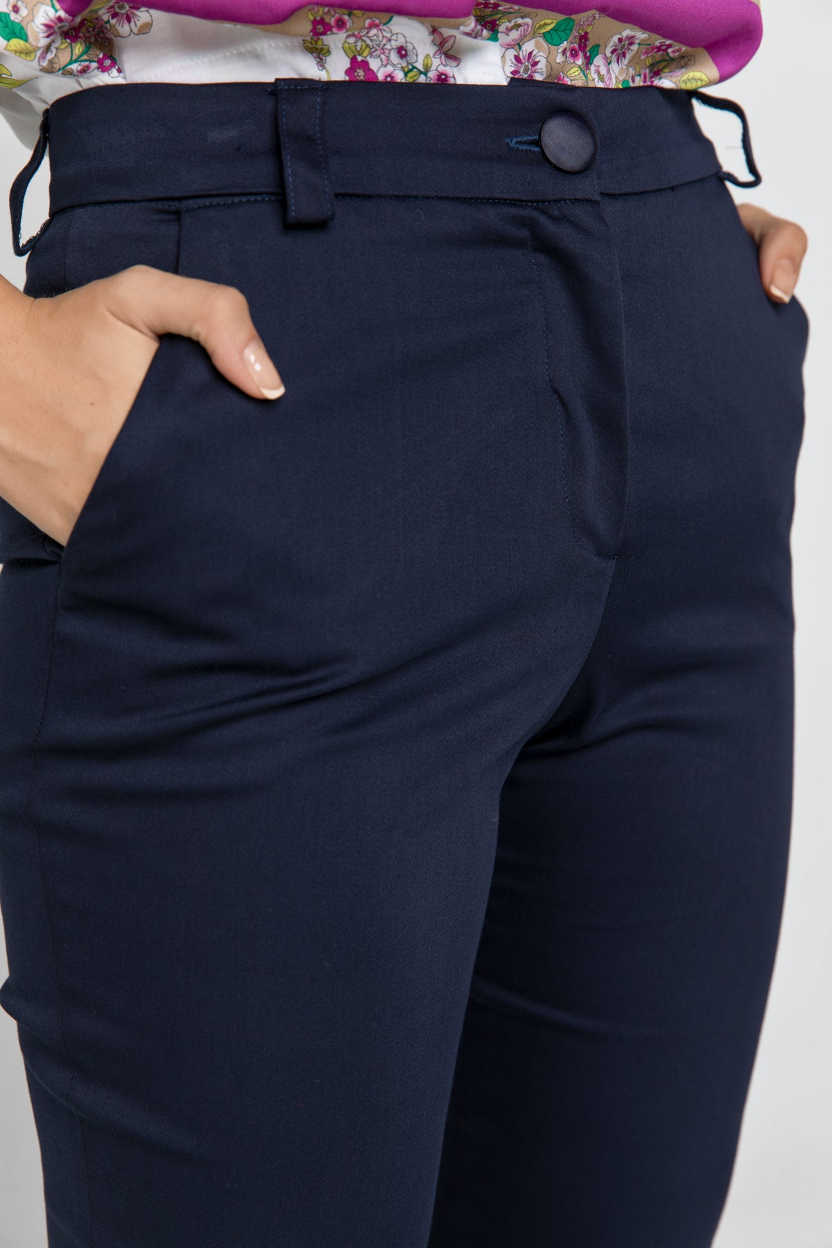 Dark blue pants in gabardine fabric. Waistband at the waist with belt loops. Concealed zip fastening with a button in the front. Faux pockets in the back. Slits at the hem. Slim fit. Our model is 176cm and is wearing size 36/S. Measurements for size 36/S (in cm): Waist-36, Bottom-45, Body length(Inside/outside)-92/66. Accessories are not included. 56%cotton-43%viscose-1%elastan