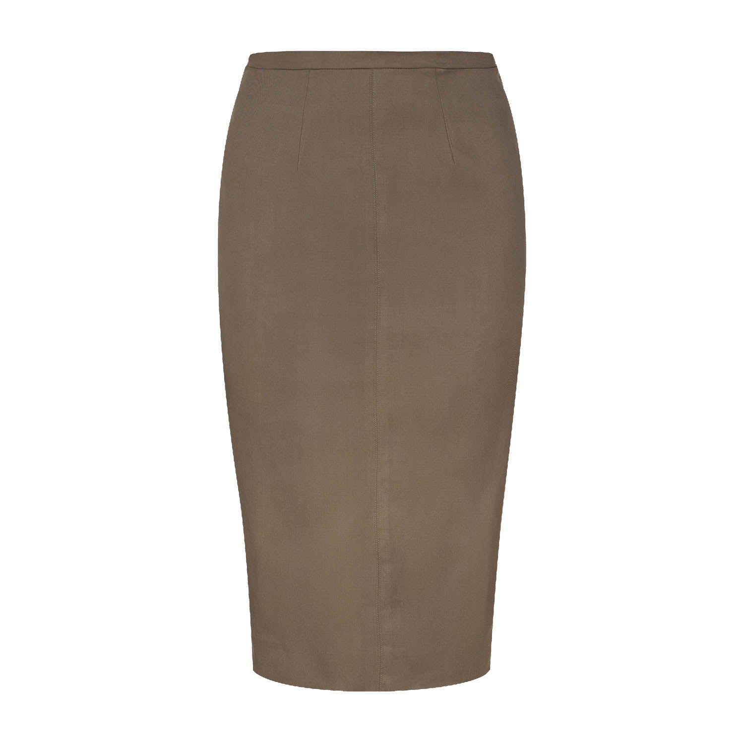 This olive fitted midi skirt is crafted in stretch woven gabardine fabric. It fastens in the back with a concealed tone on tone zip. There is a vertical seam in the front with darts below the waistband front and back. It has a slit at the back. The garment is fully lined.