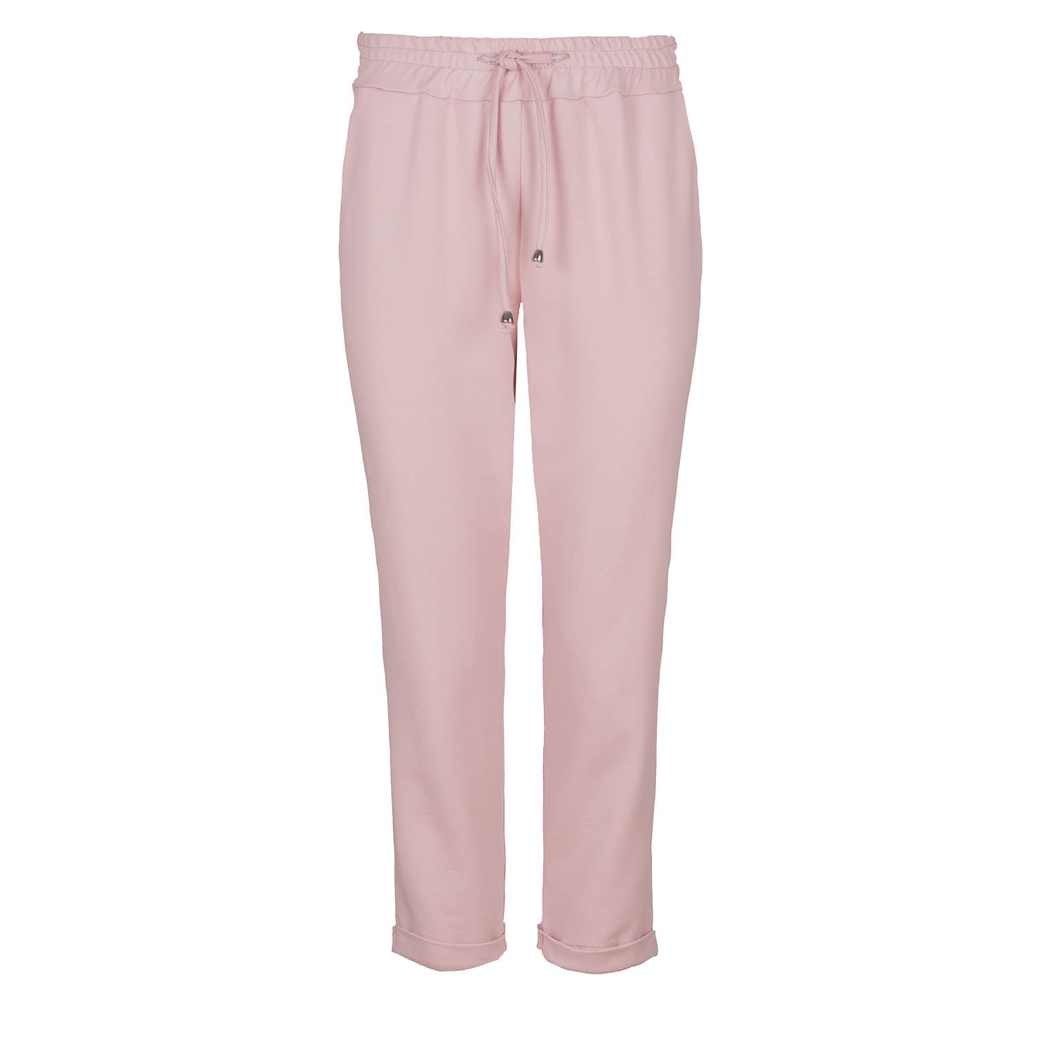These ¾ length pink sweatpants are crafted in stretch jersey fabric: cotton-elastane. The waist is elasticated with a tie in the same fabric running through internally and tying at the front. The tie has silver metal stoppers at the ends. There is a slant pocket on either side. The sweatpants have turn-ups. This garment is styled with a cropped leg and a loose fit.