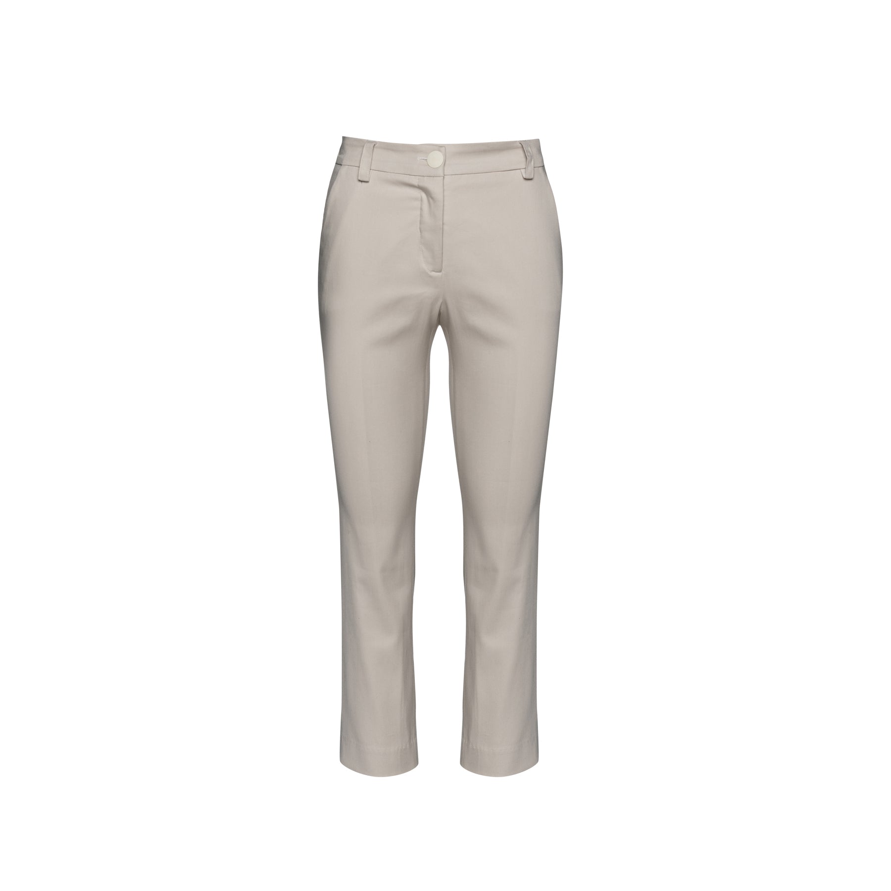Fitted ankle length pants in sand colour stretch woven gabardine fabric. 2 interior pockets in the front, 2 decorative pockets in the back. Waistband with belt loops. Concealed zip fastening with solid colour plastic button in the front. Our model is 172cm and is wearing size 36/S. Measurements for size 36 (in cm): Waist-36, Bottom-45, Body length-92/66. 56%COTTON-43%VISCOSE-1%ELASTANE
