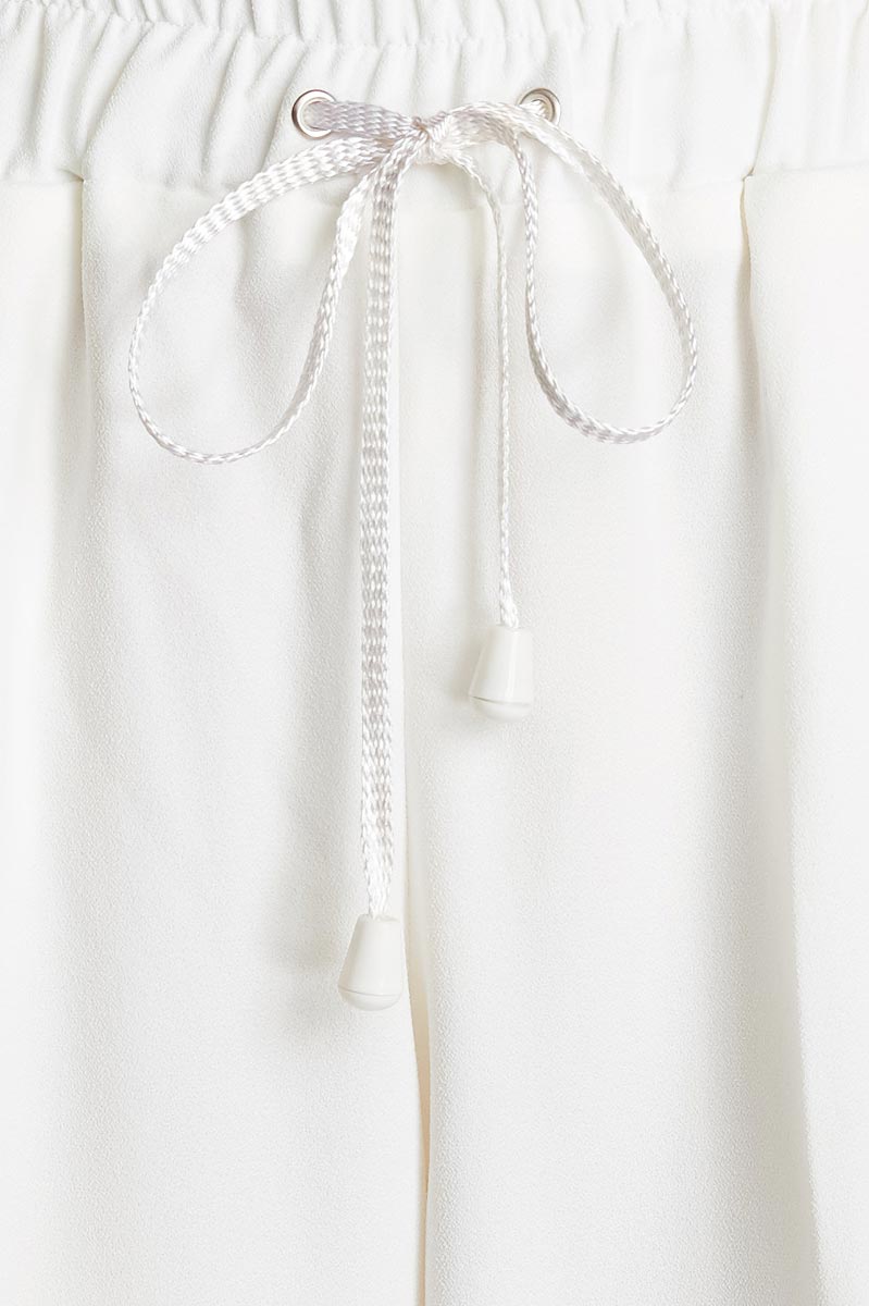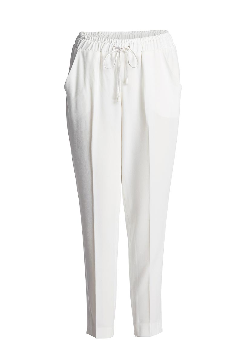 Trousers CONQUISTA in solid colour crepe polyester fabric. Elasticated waistband in the same fabric with a width of 4cm. Tie closure in the front. Side pockets. Tapered leg. Length, for size 36/S, 99cm including waistband. 92%polyester-8%elastan