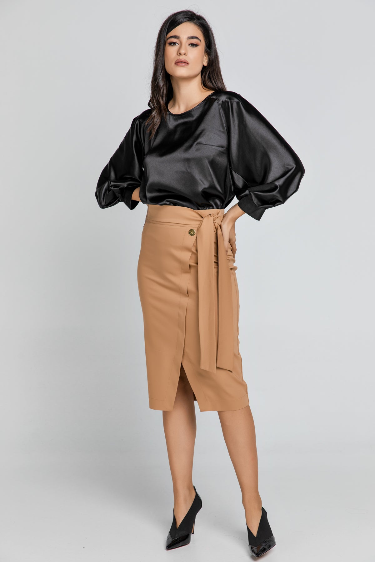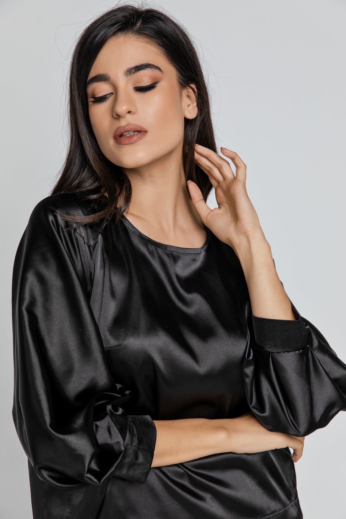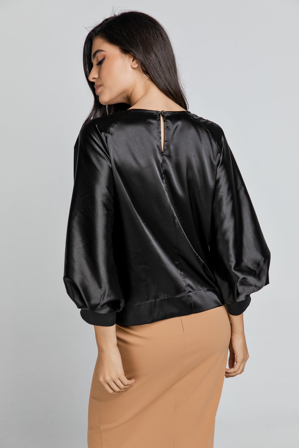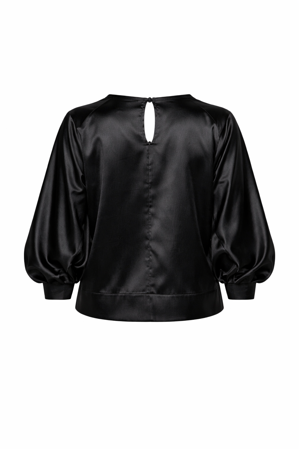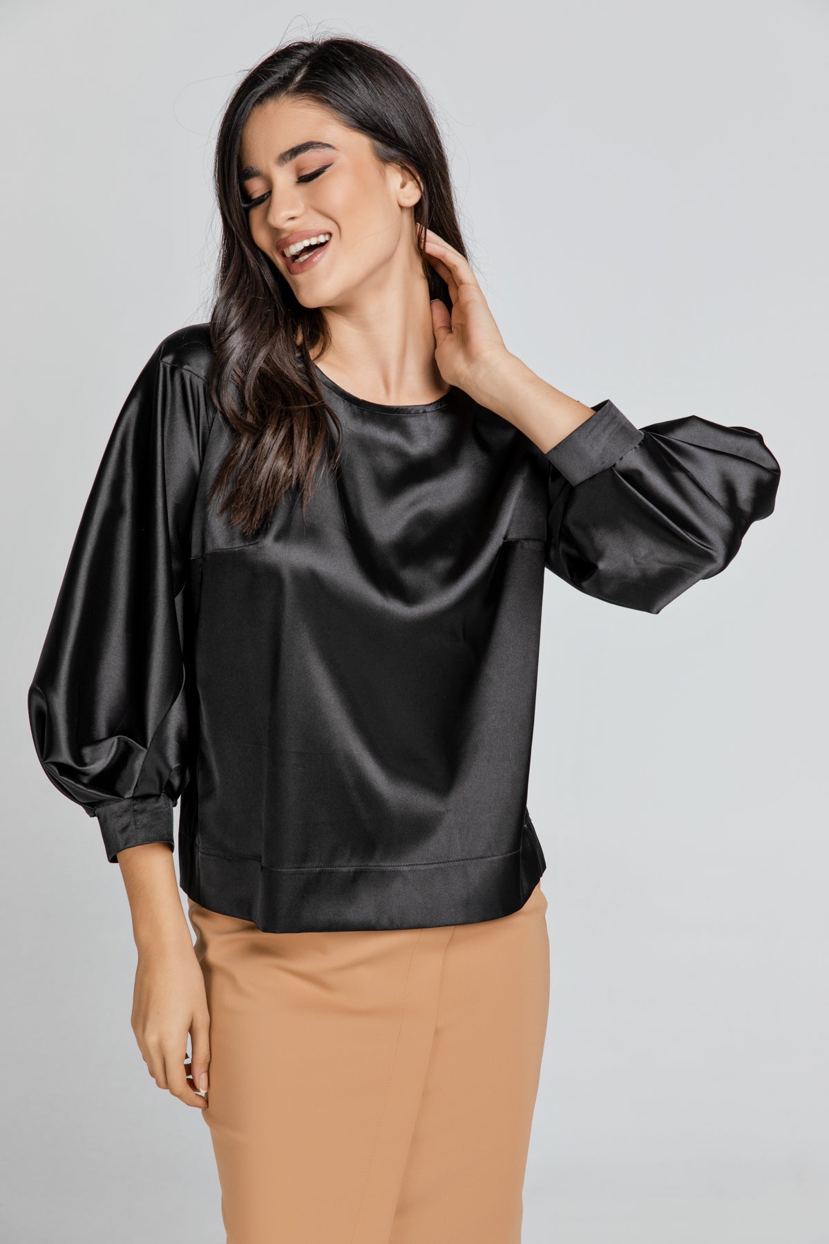 Black top with ¾ length raglan bishop sleeves. Round neckline which fastens in the back with a button. Darts at the bust. Straight silhouette.