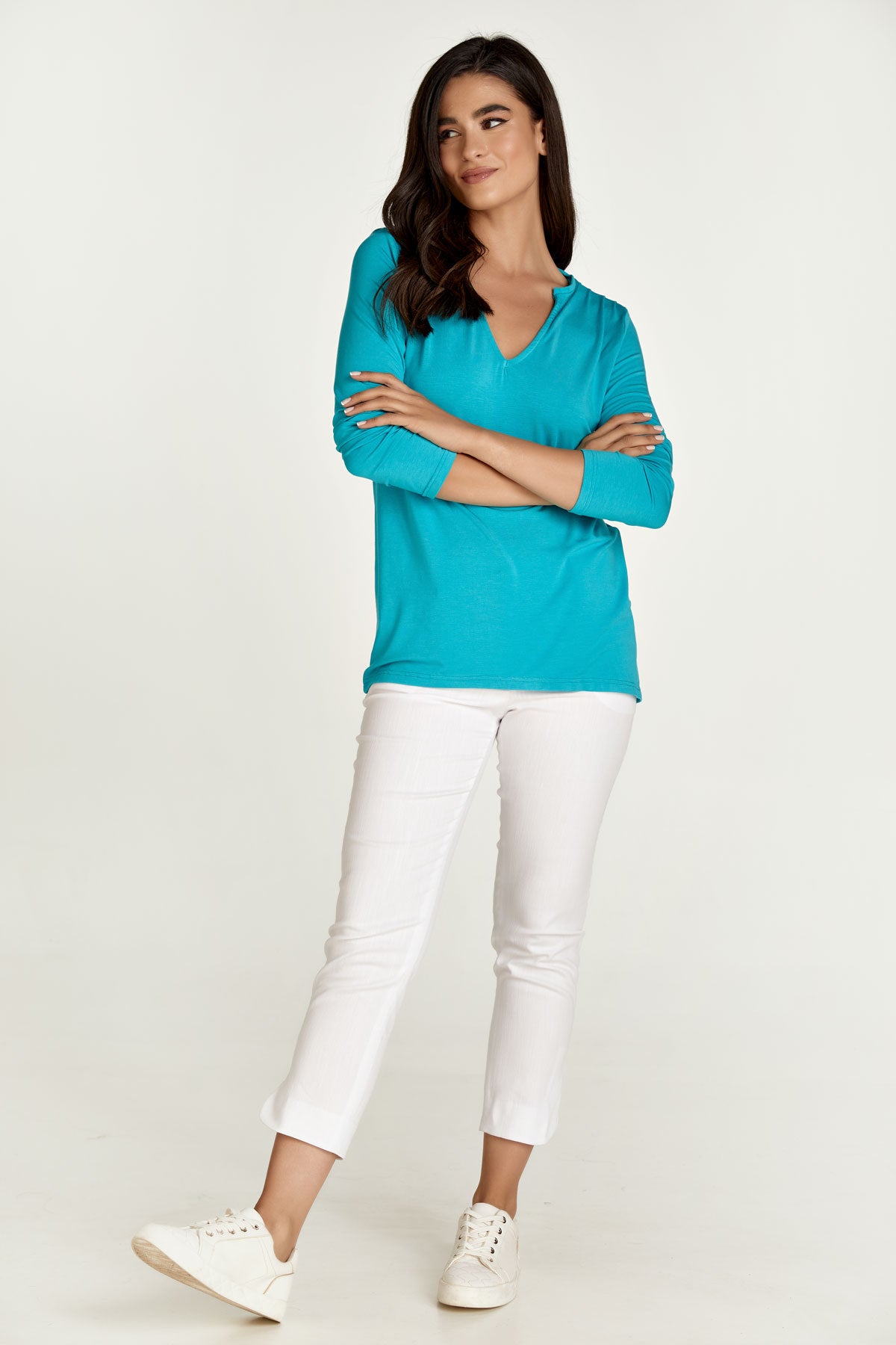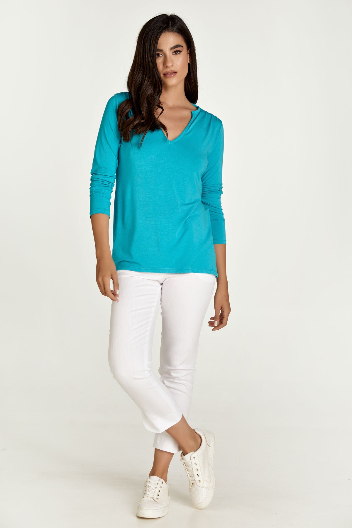 This long sleeve turquoise top is crafted in stretch jersey fabric: micromodal-elastane. It has a deep V neckline, interior trim at the neck and pleats on the front and back of the shoulder. This garment is styled in a relaxed straight silhouette.