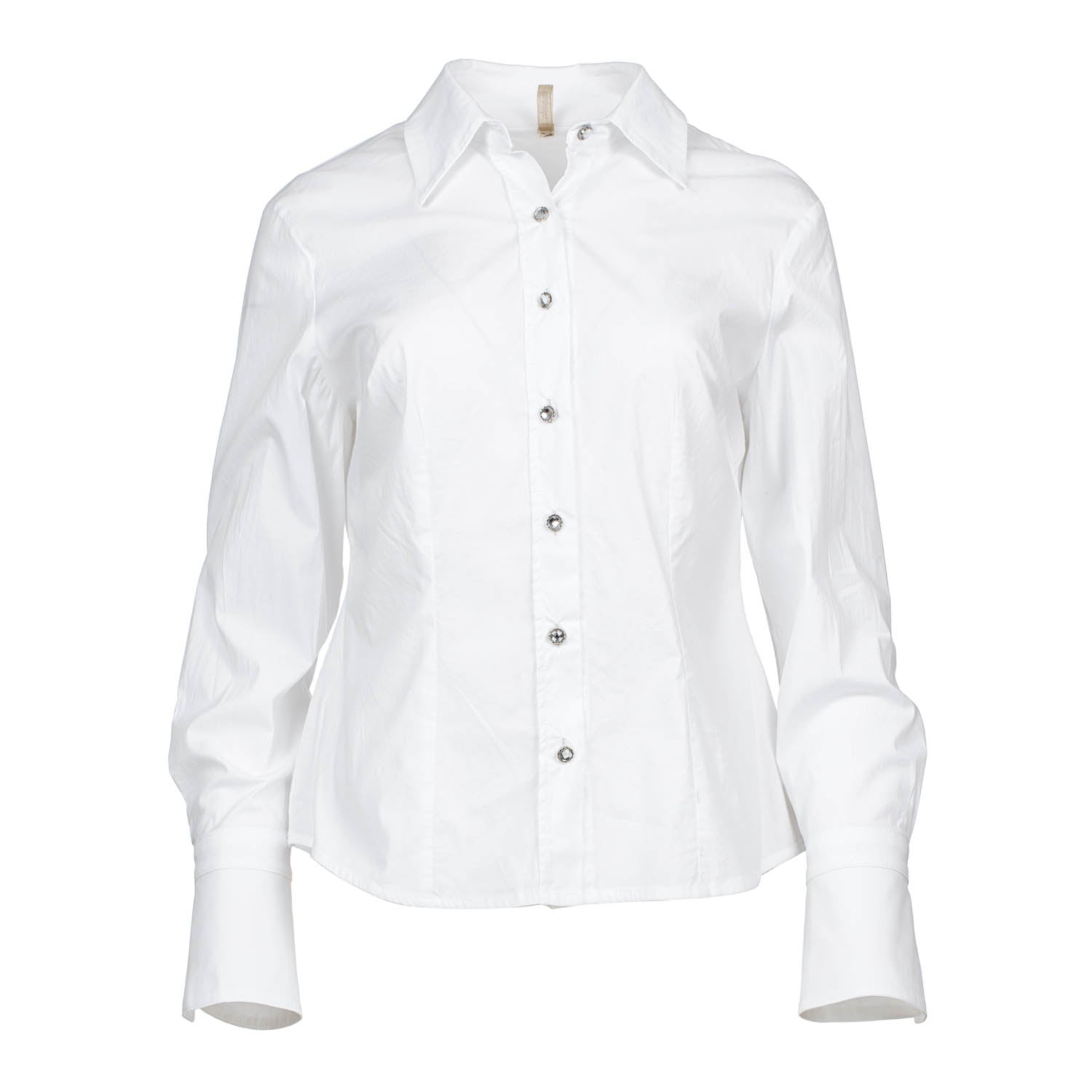 This elegant white shirt, made from 97% cotton and 3% elastane, offers both comfort and flexibility. Crafted from high-quality poplin fabric, it features eye-catching decorative buttons along the front and on the cuffs. The wide, open cuffs add a contemporary flair. Designed for a flattering fit, the chest has vertical stitching for better adaptation to your body. The back of the shirt is detailed with two decorative vertical stitchings that run from a horizontal stitch 20 cm below the shoulder to the hem. These stitchings are positioned 5 cm from the center back, adding structure and refinement to the design. Ideal for both formal and casual occasions.